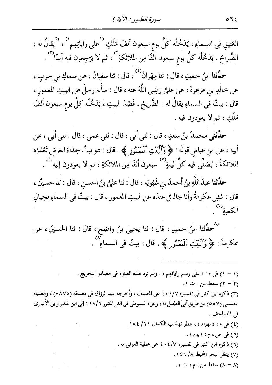 حَدَّثَنِي مُحَمَّدُ بْنُ سَعْدٍ قَالَ: ثَنِي أَبِي قَالَ: ثَنِي عَمِّي قَالَ: ثَنِي أَبِي، عَنْ أَبِيهِ، عَنِ ابْنِ عَبَّاسٍ، قَوْلَهُ: §وَالْبَيْتِ الْمَعْمُورِ قَالَ: «هُوَ بَيْتٌ حِذَاءَ الْعَرْشِ تَعْمُرُهُ الْمَلَائِكَةُ، يُصَلِّي فِيهِ كُلَّ يَوْمٍ سَبْعُونَ أَلْفًا مِنَ الْمَلَائِكَةِ ثُمَّ لَا يَعُودُونَ إِلَيْهِ»