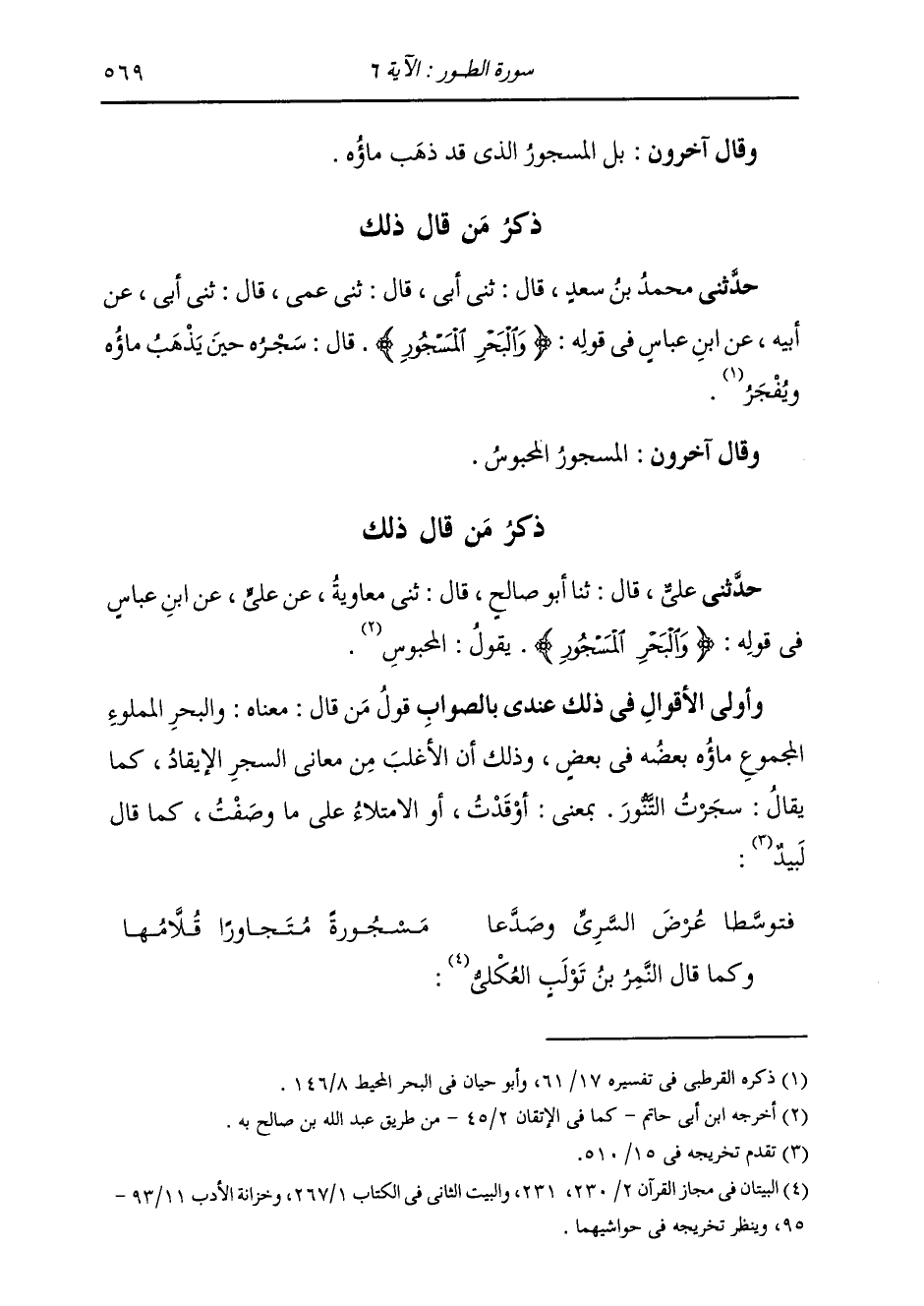 ذِكْرُ مَنْ قَالَ ذَلِكَ: حَدَّثَنِي عَلِيٌّ قَالَ: ثَنَا أَبُو صَالِحٍ قَالَ: ثَنِي مُعَاوِيَةُ، عَنْ عَلِيٍّ، عَنِ ابْنِ عَبَّاسٍ، فِي قَوْلِهِ: {§وَالْبَحْرِ الْمَسْجُورِ} [الطور: 6] يَقُولُ: «الْمَحْبُوسُ» وَأَوْلَى الْأَقْوَالِ فِي ذَلِكَ عِنْدِي بِالصَّوَابِ قَوْلُ مَنْ قَالَ: مَعْنَاهُ: وَالْبَحْرِ الْمَمْلُوءِ الْمَجْمُوعِ مَاؤُهُ بَعْضُهُ فِي بَعْضٍ، وَذَلِكَ أَنَّ الْأَغْلَبَ مِنْ مَعَانِي السَّجْرِ: الْإِيقَادُ، كَمَا يُقَالُ: سُجِّرَتِ التَّنُّورُ، بِمَعْنَى: أُوقِدَتْ، أَوِ الِامْتِلَاءُ عَلَى مَا وَصَفْتُ، كَمَا قَالَ لَبِيدٌ: