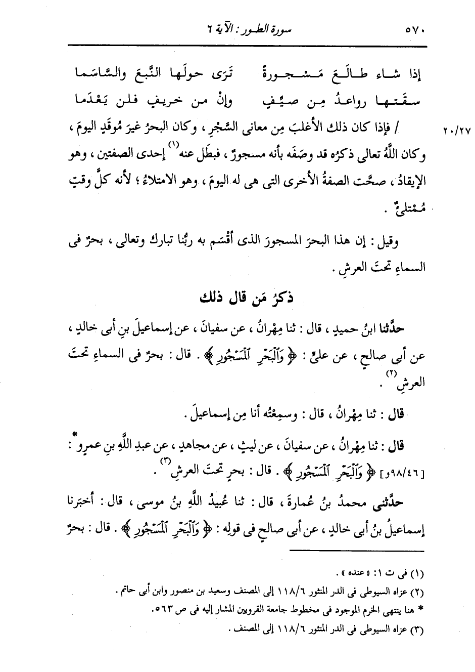 فَإِذَا كَانَ ذَلِكَ الْأَغْلَبُ مِنْ مَعَانِي السَّجْرِ، وَكَانَ الْبَحْرُ غَيْرَ مُوقَدٍ الْيَوْمَ، وَكَانَ اللَّهُ تَعَالَى ذِكْرُهُ قَدْ وَصَفَهُ بِأَنَّهُ مَسْجُورٌ، فَبَطَلَ عَنْهُ إِحْدَى الصِّفَتَيْنِ، وَهُوَ الْإِيقَادُ صَحَّتِ الصِّفَةُ الْأُخْرَى الَّتِي هِيَ لَهُ الْيَوْمُ، وَهُوَ الِامْتِلَاءُ، لِأَنَّهُ كُلَّ وَقْتٍ مُمْتَلِئٌ وَقِيلَ: إِنَّ هَذَا الْبَحْرَ الْمَسْجُورَ الَّذِي أَقْسَمَ بِهِ رَبُّنَا تَبَارَكَ وَتَعَالَى بَحْرٌ فِي السَّمَاءِ تَحْتَ الْعَرْشِ