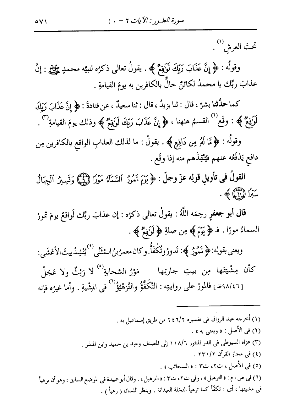 §الْقَوْلُ فِي تَأْوِيلِ قَوْلِهِ تَعَالَى: {يَوْمَ تَمُورُ السَّمَاءُ مَوْرًا وَتَسِيرُ الْجِبَالُ سَيْرًا} [الطور: 10] يَقُولُ تَعَالَى ذِكْرُهُ: إِنَّ عَذَابَ رَبِّكَ لَوَاقِعٌ {يَوْمَ تَمُورُ السَّمَاءُ مَوْرًا} [الطور: 9] فَيَوْمُ مِنْ صِلَةِ وَاقِعٍ، وَيَعْنِي بِقَوْلِهِ: تَمُورُ: تَدُورُ وَتُكْفَأُ وَكَانَ مَعْمَرُ بْنُ الْمُثَنَّى يُنْشِدُ بَيْتَ الْأَعْشَى: