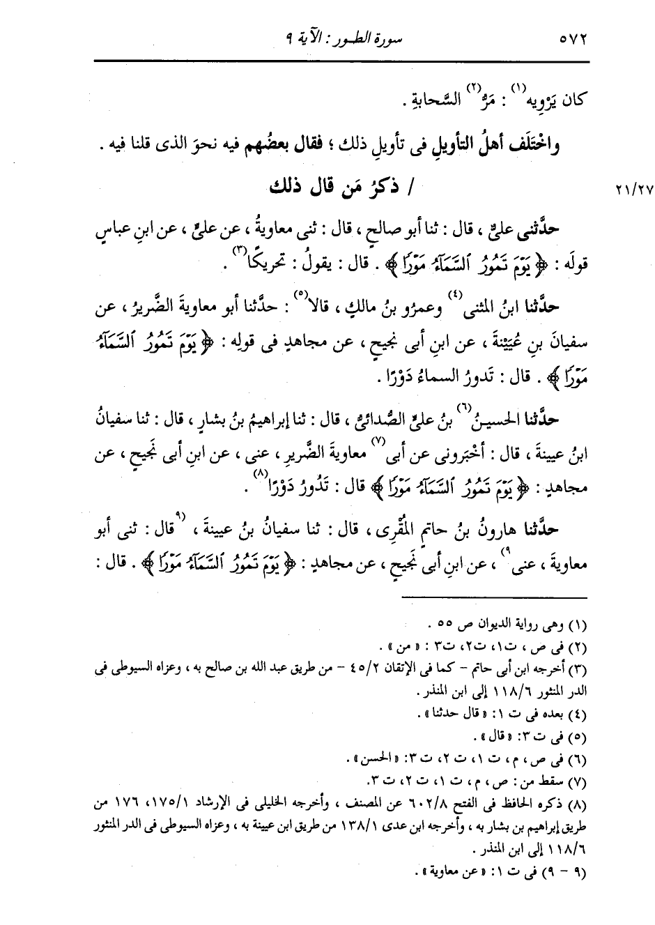 حَدَّثَنَا هَارُونُ بْنُ حَاتِمٍ الْمُقْرِي قَالَ: ثَنَا سُفْيَانُ بْنُ عُيَيْنَةَ قَالَ: ثَنِي أَبُو مُعَاوِيَةَ عَنِّي عَنِ ابْنِ أَبِي نَجِيحٍ، عَنْ مُجَاهِدٍ {§يَوْمَ تَمُورُ السَّمَاءُ مَوْرًا} [الطور: 9] قَالَ: «-[573]- تَدُورُ دَوْرًا»