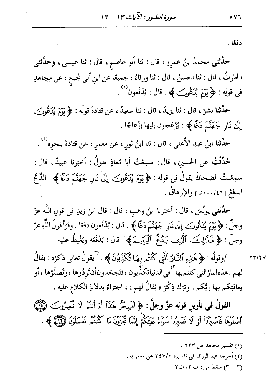 حَدَّثَنِي مُحَمَّدُ بْنُ عَمْرٍو قَالَ: ثَنَا أَبُو عَاصِمٍ قَالَ: ثَنَا عِيسَى، وَحَدَّثَنِي الْحَارِثُ قَالَ: ثَنَا الْحَسَنُ قَالَ: ثَنَا وَرْقَاءُ، جَمِيعًا، عَنِ ابْنِ أَبِي نَجِيحٍ، عَنْ مُجَاهِدٍ، فِي قَوْلِهِ: {§يَوْمَ يُدَعُّونَ إِلَى نَارِ جَهَنَّمَ} [الطور: 13] قَالَ: «يُدْفَعُونَ»