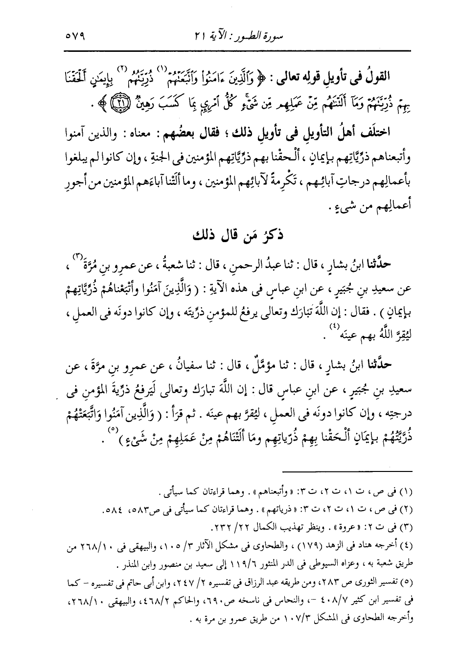 حَدَّثَنَا ابْنُ بَشَّارٍ قَالَ: ثَنَا مُؤَمَّلٌ قَالَ: ثَنَا سُفْيَانُ، عَنْ عَمْرِو بْنِ مُرَّةَ، عَنْ سَعِيدِ بْنِ جُبَيْرٍ، عَنِ ابْنِ عَبَّاسٍ قَالَ: «§إِنَّ اللَّهَ تَبَارَكَ وَتَعَالَى لَيَرْفَعُ ذُرِّيَّةَ الْمُؤْمِنِ فِي دَرَجَتِهِ، وَإِنْ كَانُوا دُونَهُ فِي الْعَمَلِ، لِيُقِرَّ بِهِمْ عَيْنَهُ» ، ثُمَّ قَرَأَ (وَالَّذِينَ آمَنُوا وَاتَّبَعَتْهُمْ ذُرِّيَّتُهُمْ بِإِيمَانٍ أَلْحَقْنَا بِهِمْ ذُرِّيَّاتِهِمْ وَمَا أَلَتْنَاهُمْ مِنْ عَمَلِهِمْ مِنْ شَيْءٍ)