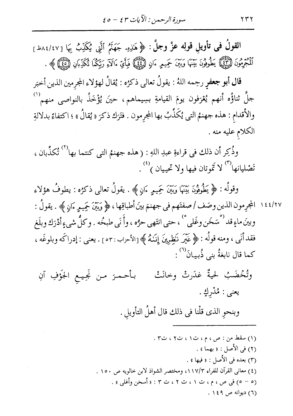 §الْقَوْلُ فِي تَأْوِيلِ قَوْلِهِ تَعَالَى: {هَذِهِ جَهَنَّمُ الَّتِي يُكَذِّبُ بِهَا الْمُجْرِمُونَ يَطُوفُونَ بَيْنَهَا وَبَيْنَ حَمِيمٍ آنٍ فَبِأَيِّ آلَاءِ رَبِّكُمَا تُكَذِّبَانِ} [الرحمن: 44] يَقُولُ تَعَالَى ذِكْرُهُ: يُقَالُ لِهَؤُلَاءِ الْمُجْرِمِينَ الَّذِينَ أَخْبَرَ جَلَّ ثَنَاؤُهُ أَنَّهُمْ يُعْرَفُونَ يَوْمَ الْقِيَامَةِ بِسِيمَاهُمْ حِينَ يُؤْخَذُ بِالنَّوَاصِي وَالْأَقْدَامِ: هَذِهِ جَهَنَّمُ الَّتِي يُكَذِّبُ بِهَا الْمُجْرِمُونِ، فَتَرَكَ ذِكْرَ «يُقَالُ» اكْتِفَاءً بِدِلَالَةِ الْكَلَامِ عَلَيْهِ مِنْهُ وَذُكِرَ أَنَّ ذَلِكَ فِي قِرَاءَةِ عَبْدِ اللَّهِ «هَذِهِ جَهَنَّمُ الَّتِي كُنْتُمَا بِهَا تُكَذِّبَانِ تَصْلَيَانِهَا، لَا تَمُوتَانِ فِيهَا وَلَا تَحْيَيَانِ»