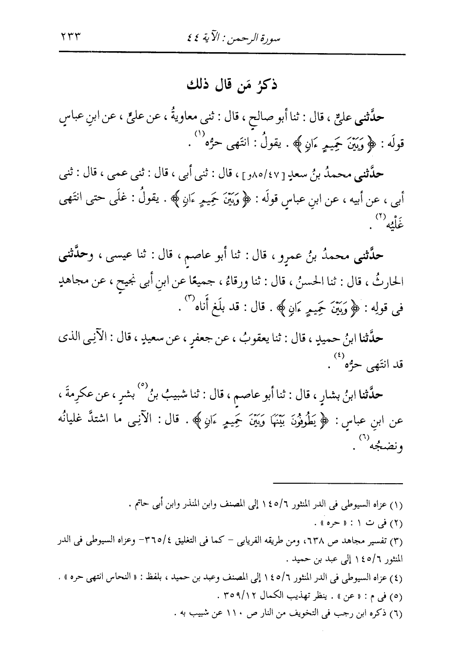 ذِكْرُ مَنْ قَالَ ذَلِكَ: حَدَّثَنِي عَلِيٌّ قَالَ: ثَنَا أَبُو صَالِحٍ قَالَ: ثَنِي مُعَاوِيَةُ، عَنْ عَلِيٍّ، عَنِ ابْنِ عَبَّاسٍ، قَوْلَهُ: {§وَبَيْنَ حَمِيمٍ آنٍ} [الرحمن: 44] يَقُولُ: «انْتَهَى حَرُّهُ»