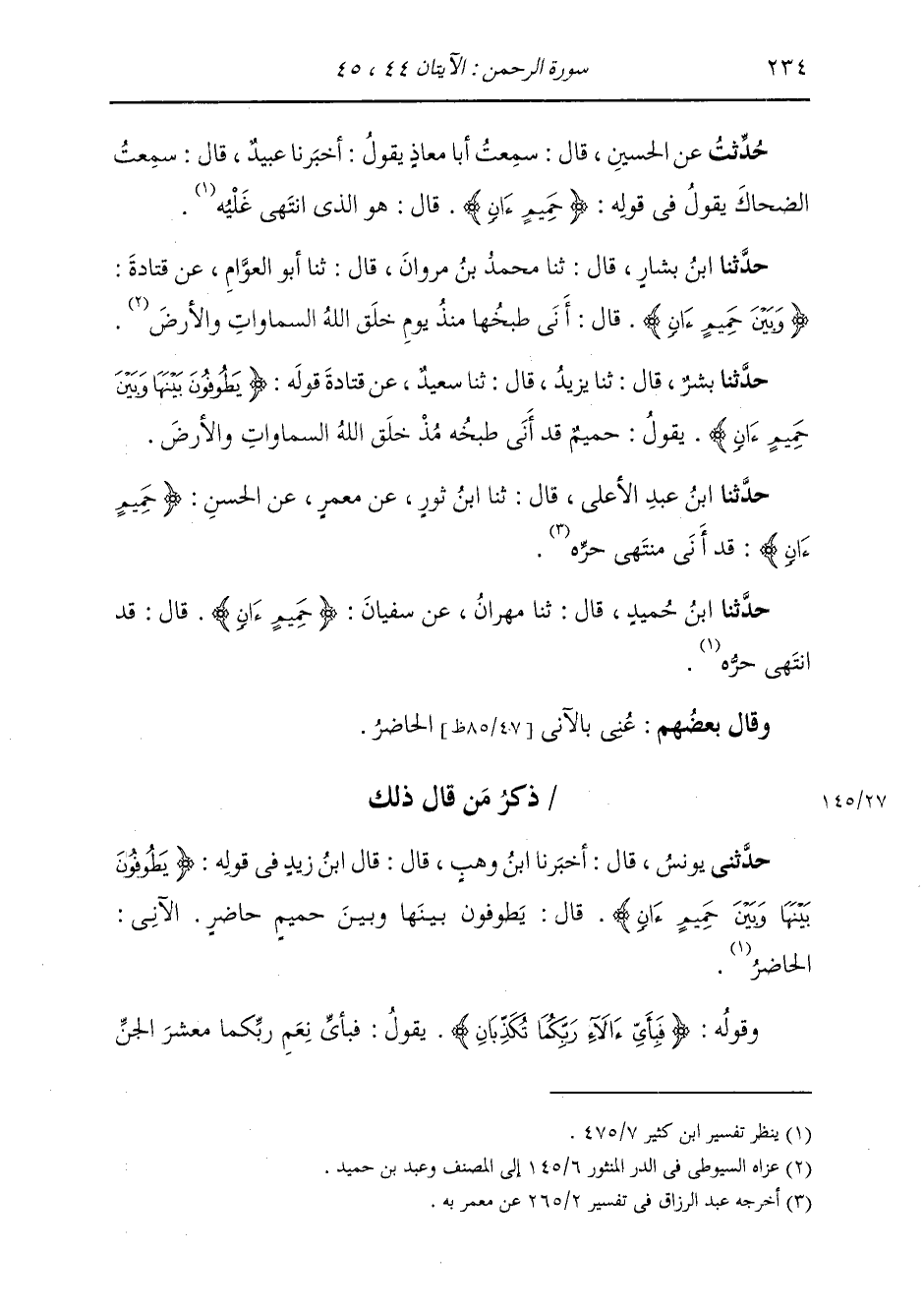 حَدَّثَنَا ابْنُ حُمَيْدٍ قَالَ: ثَنَا مِهْرَانُ، عَنْ سُفْيَانَ، {§حَمِيمٍ آنٍ} [الرحمن: 44] قَالَ: «قَدِ انْتَهَى حَرُّهُ» وَقَالَ بَعْضُهُمْ: عُنِيَ بِالْآنِي: الْحَاضِرُ