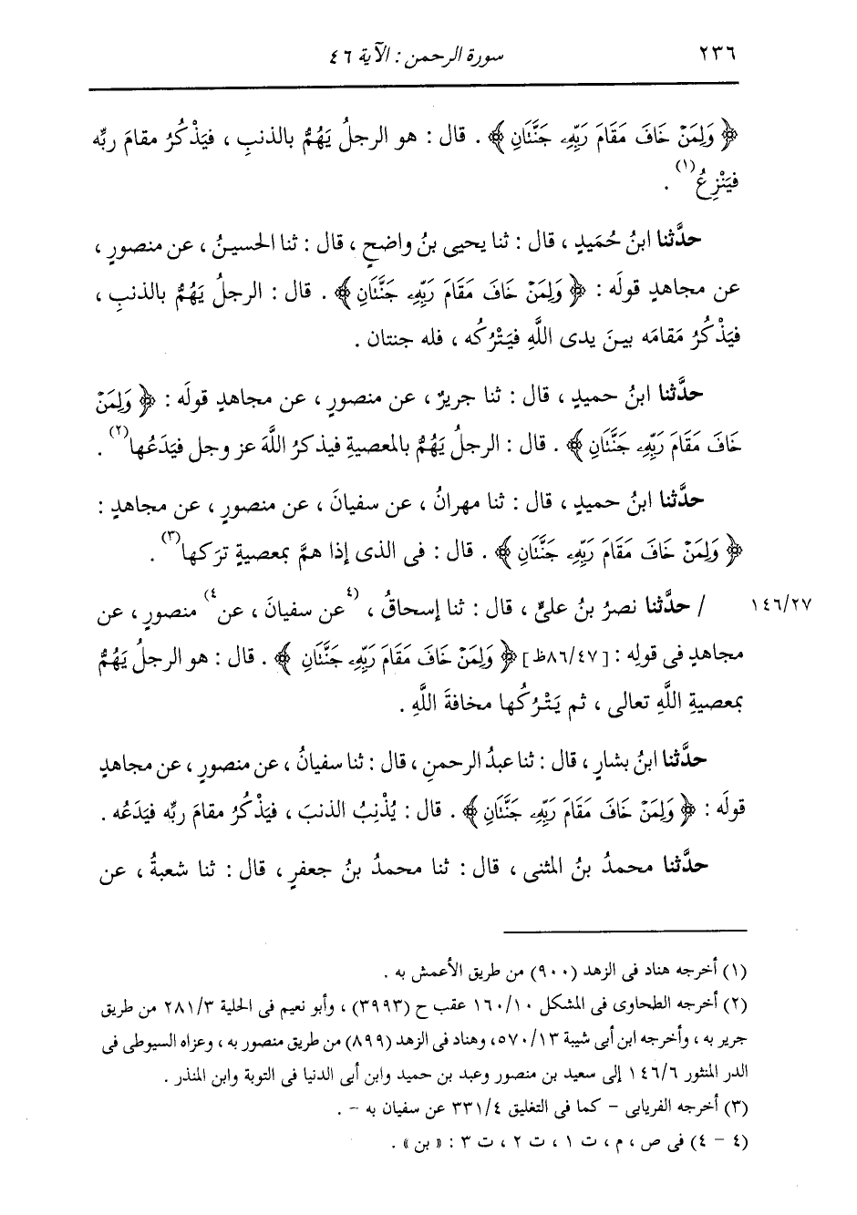 قَالَ: ثَنَا مِهْرَانُ، عَنْ سُفْيَانَ، عَنْ مَنْصُورٍ، عَنْ مُجَاهِدٍ {§وَلِمَنْ خَافَ مَقَامَ رَبِّهِ جَنَّتَانِ} [الرحمن: 46] قَالَ: «فِي الَّذِي إِذَا هَمَّ بِمَعْصِيَةٍ تَرَكَهَا»