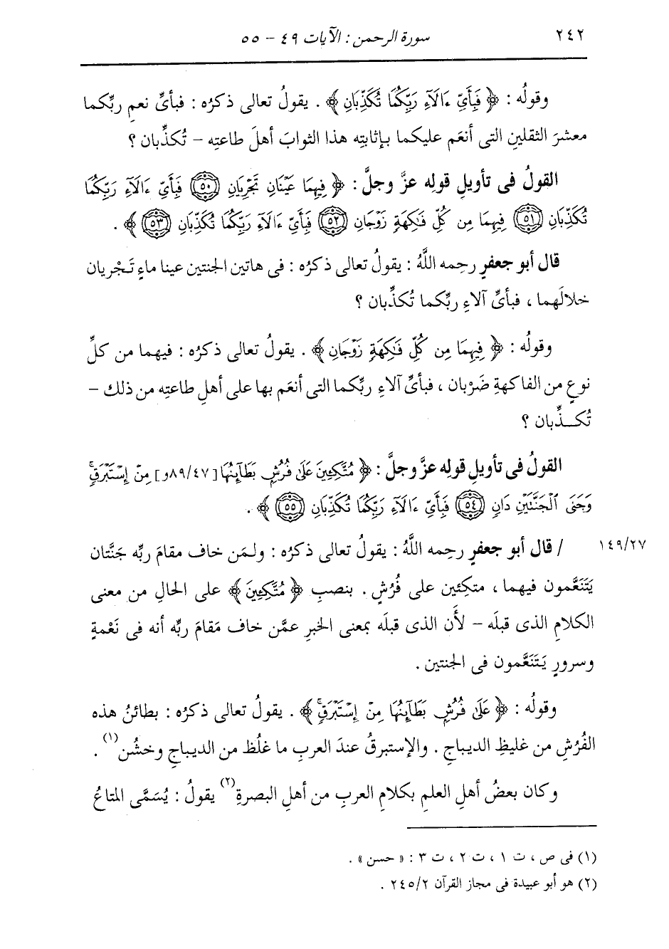 §الْقَوْلُ فِي تَأْوِيلِ قَوْلِهِ تَعَالَى: {فِيهِمَا عَيْنَانِ تَجْرِيَانِ فَبِأَيِّ آلَاءِ رَبِّكُمَا تُكَذِّبَانِ فِيهِمَا مِنْ كُلِّ فَاكِهَةٍ زَوْجَانِ فَبِأَيِّ آلَاءِ رَبِّكُمَا تُكَذِّبَانِ} [الرحمن: 51] يَقُولُ تَعَالَى ذِكْرُهُ فِي هَاتَيْنِ الْجَنَّتَيْنِ عَيْنَا مَاءٍ تَجْرِيَانِ خِلَالَهُمَا، فَبِأَيِّ آلَاءِ رَبِّكُمَا تُكَذِّبَانِ