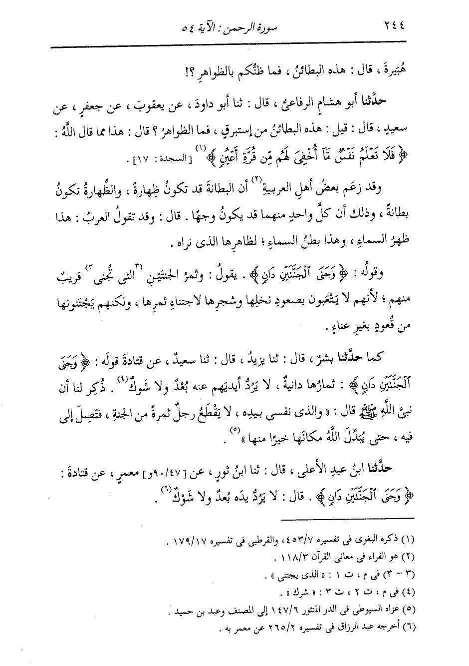 حَدَّثَنَا أَبُو هِشَامٍ الرِّفَاعِيُّ قَالَ: ثَنَا أَبُو دَاوُدَ، عَنْ يَعْقُوبَ، عَنْ جَعْفَرٍ، عَنْ سَعِيدٍ قَالَ: قِيلَ لَهُ: " هَذِهِ §الْبَطَائِنُ مِنْ إِسْتَبْرَقٍ فَمَا الظَّوَاهِرُ؟ قَالَ: هَذَا مِمَّا قَالَ اللَّهُ {فَلَا تَعْلَمُ نَفْسٌ مَا أُخْفِيَ لَهُمْ مِنْ قُرَّةِ أَعْيُنٍ} [السجدة: 17] " وَقَدْ زَعَمَ أَهْلُ الْعَرَبِيَّةِ أَنَّ الْبِطَانَةَ قَدْ تَكُونُ ظِهَارَةً، وَالظِّهَارَةُ تَكُونُ بِطَانَةً، وَذَلِكَ أَنَّ كُلَّ وَاحِدٍ مِنْهُمَا قَدْ يَكُونُ وَجْهًا قَالَ: وَتَقُولُ الْعَرَبُ: هَذَا ظَهْرُ السَّمَاءِ، وَهَذَا بَطْنُ السَّمَاءِ لِظَاهِرِهَا الَّذِي نَرَاهُ