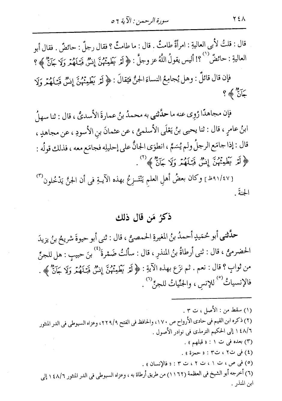 ذِكْرُ مَنْ قَالَ ذَلِكَ: حَدَّثَنِي أَبُو حُمَيْدٍ أَحْمَدُ بْنُ الْمُغِيرَةِ الْحِمْصِيُّ قَالَ: ثَنِي أَبُو حَيْوَةَ شُرَيْحُ بْنُ يَزِيدَ الْحَضْرَمِيُّ قَالَ: ثَنِي أَرْطَاةُ بْنُ الْمُنْذِرِ قَالَ: سَأَلْتُ ضَمْرَةَ بْنَ حَبِيبٍ: هَلْ لِلْجِنِّ مِنْ ثَوَابٍ؟ قَالَ: «نَعَمْ، ثُمَّ نَزَعَ بِهَذِهِ الْآيَةِ» {§لَمْ يَطْمِثْهُنَّ إِنْسٌ قَبْلَهُمْ وَلَا جَانٌّ} [الرحمن: 56] «فَالْإِنْسِيَّاتُ لِلْإِنْسِ، وَالْجِنِّيَّاتُ لِلْجِنِّ»