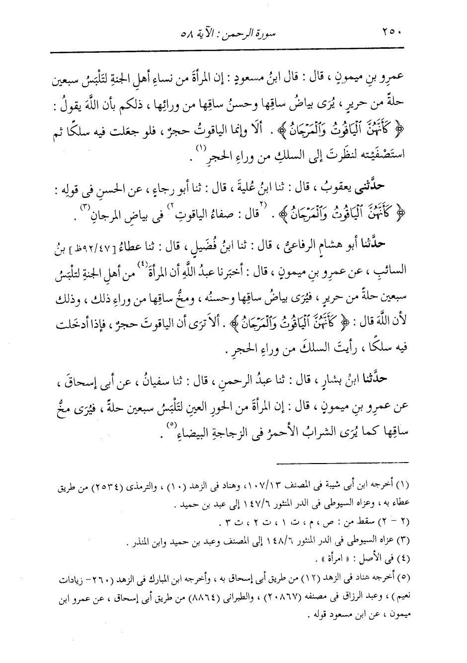 حَدَّثَنَا ابْنُ بَشَّارٍ قَالَ: ثَنَا عَبْدُ الرَّحْمَنِ قَالَ: ثَنَا سُفْيَانُ، عَنْ أَبِي إِسْحَاقَ، عَنْ عَمْرِو بْنِ مَيْمُونٍ قَالَ: «إِنَّ §الْمَرْأَةَ مِنَ الْحُورِ الْعِينِ لَتَلْبَسُ سَبْعِينَ حُلَّةً، فَيُرَى مُخُّ سَاقِهَا كَمَا يُرَى الشَّرَابُ الْأَحْمَرُ فِي الزُّجَاجَةِ الْبَيْضَاءِ»