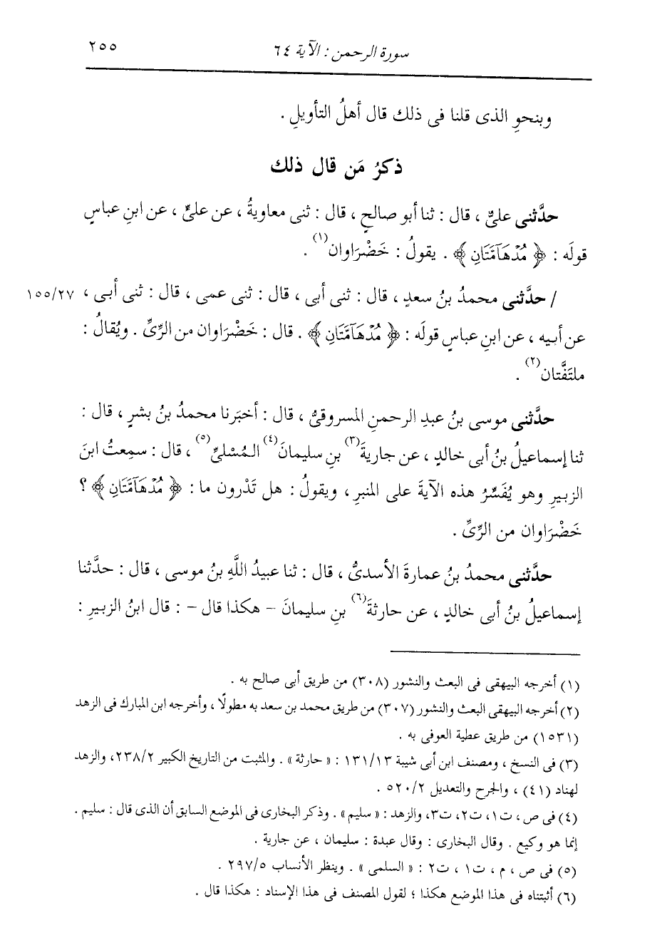 حَدَّثَنِي مُوسَى بْنُ عَبْدِ الرَّحْمَنِ الْمَسْرُوقِيُّ قَالَ: أَخْبَرَنَا مُحَمَّدُ بْنُ بِشْرٍ قَالَ: ثَنَا إِسْمَاعِيلُ بْنُ أَبِي خَالِدٍ، عَنْ حَارِثَةَ بْنِ سُلَيْمَانَ السُّلَمِيِّ قَالَ: سَمِعْتُ ابْنَ الزُّبَيْرِ، وَهُوَ يُفَسِّرُ هَذِهِ الْآيَةَ عَلَى الْمِنْبَرِ، وَهُوَ يَقُولُ: هَلْ تَدْرُونَ مَا {§مُدْهَامَّتَانِ} [الرحمن: 64] ؟ «خَضْرَاوَانِ مِنَ الرِّيِّ»
