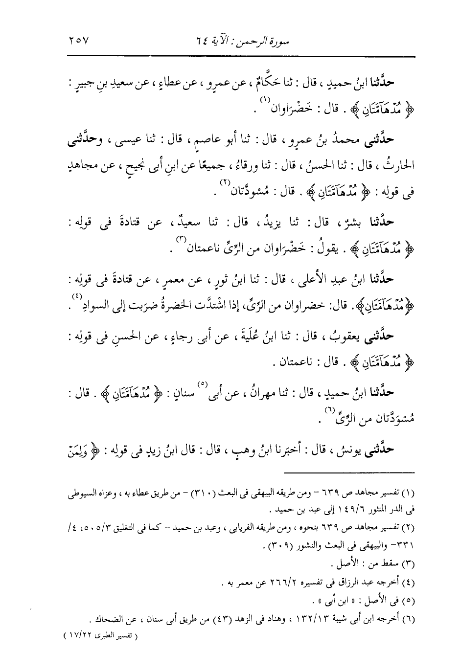 قَالَ: ثَنَا حَكَّامٌ، عَنْ عَمْرٍو، عَنْ عَطَاءٍ، عَنْ سَعِيدِ بْنِ جُبَيْرٍ، {§مُدْهَامَّتَانِ} [الرحمن: 64] قَالَ: «خَضْرَاوَانِ»