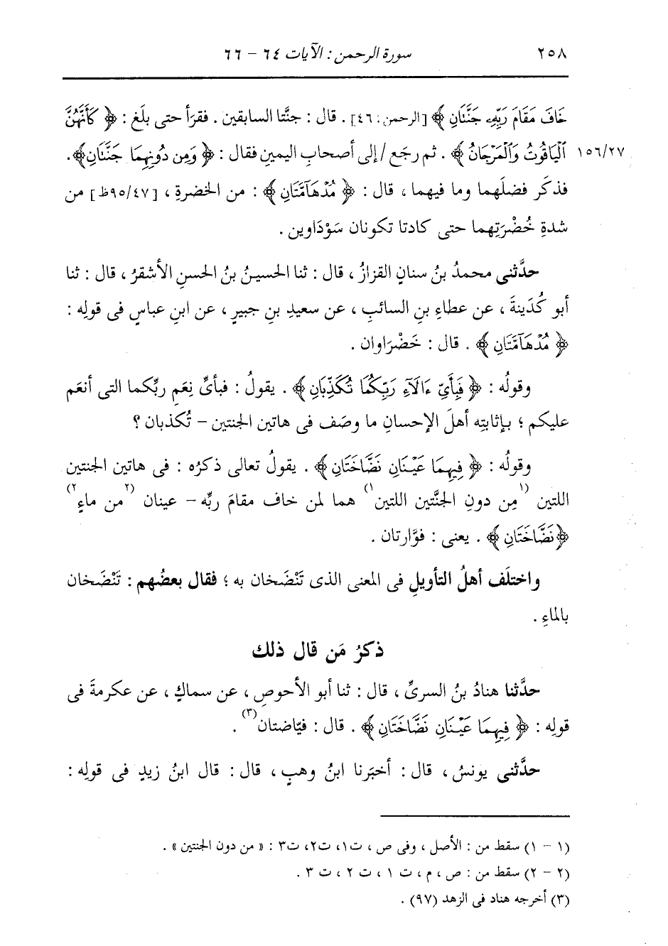 ذِكْرُ مَنْ قَالَ ذَلِكَ: حَدَّثَنَا هَنَّادُ بْنُ السَّرِيِّ قَالَ: ثَنَا أَبُو الْأَحْوَصِ، عَنْ سِمَاكٍ، عَنْ عِكْرِمَةَ، فِي قَوْلِهِ: {§فِيهِمَا عَيْنَانِ نَضَّاخَتَانِ} [الرحمن: 66] قَالَ: «يَنْضَخَانِ بِالْمَاءِ»