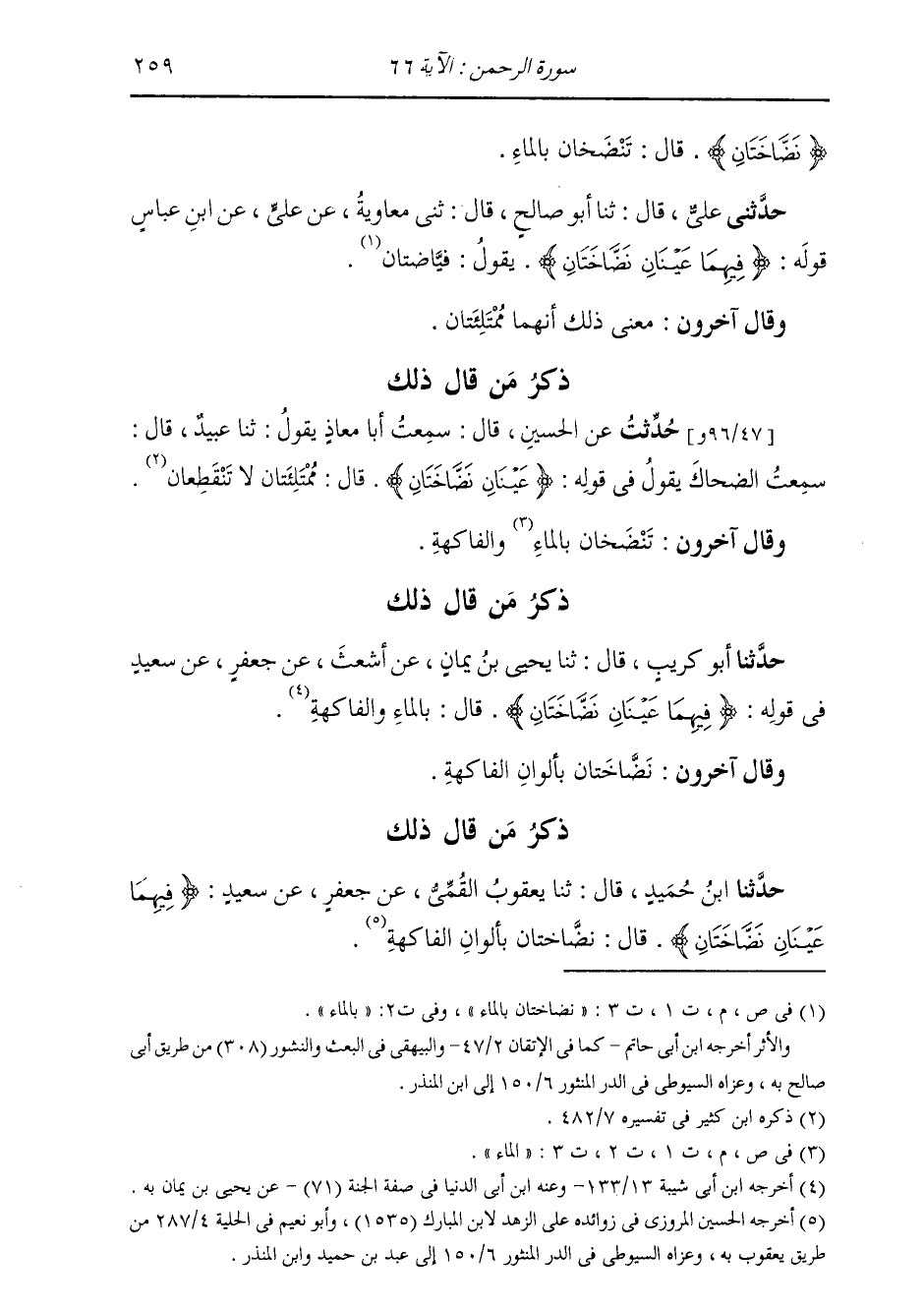 حَدَّثَنِي عَلِيٌّ قَالَ: ثَنَا أَبُو صَالِحٍ قَالَ: ثَنِي مُعَاوِيَةُ، عَنْ عَلِيٍّ، عَنِ ابْنِ عَبَّاسٍ، قَوْلَهُ: {§فِيهِمَا عَيْنَانِ نَضَّاخَتَانِ} [الرحمن: 66] يَقُولُ: «نَضَّاخَتَانِ بِالْمَاءِ» وَقَالَ آخَرُونَ: بَلْ مَعْنَى ذَلِكَ أَنَّهُمَا مُمْتَلِئَتَانِ