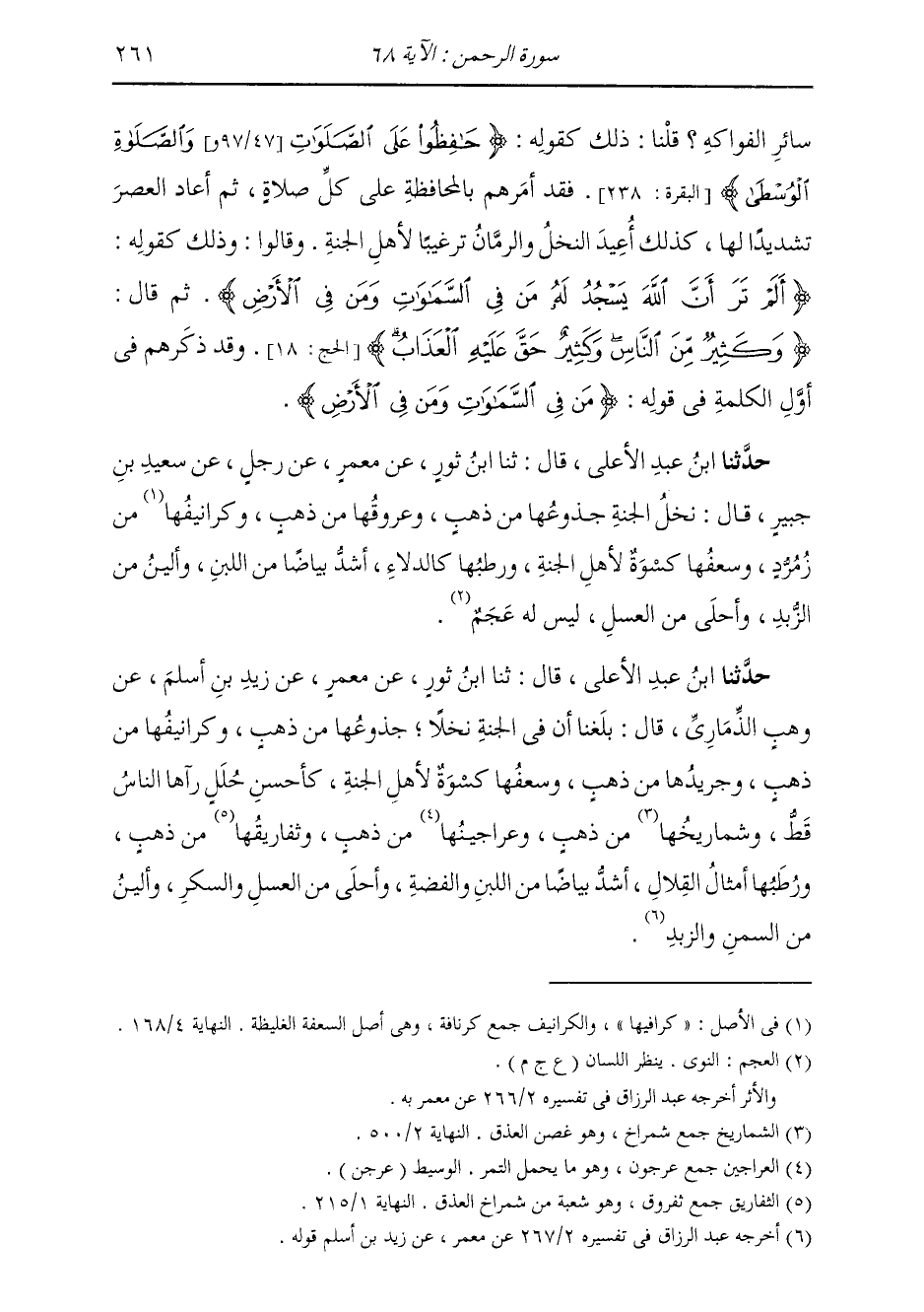 قَالَ: ثَنَا ابْنُ ثَوْرٍ، عَنْ مَعْمَرٍ، عَنْ زَيْدِ بْنِ أَسْلَمَ، عَنْ وَهْبٍ الذِّمَارِيِّ قَالَ: «§بَلْغَنَا أَنَّ فِي، الْجَنَّةِ نَخْلًا جُذُوعُهَا مِنْ ذَهَبٍ، وَكَرَانِيفُهَا مِنْ ذَهَبٍ، وَجَرِيدُهَا مِنْ ذَهَبٍ وَسَعَفُهَا كِسْوَةٌ لِأَهْلِ الْجَنَّةِ، كَأَحْسَنِ حُلَلٍ رَآهَا النَّاسُ قَطُّ، وَشَمَارِيخُهَا مِنْ ذَهَبٍ وَعَرَاجِينُهَا مِنْ ذَهَبٍ، وَثَفَارِيقُهَا مِنْ ذَهَبٍ، وَرُطَبُهَا أَمْثَالُ الْقِلَالِ، أَشَدَّ بَيَاضًا مِنَ اللَّبَنِ وَالْفِضَّةِ، وَأَحْلَى مِنَ الْعَسَلِ وَالْسُّكَّرِ، وَأَلْيَنَ مِنَ الزُّبْدِ وَالسَّمْنِ»