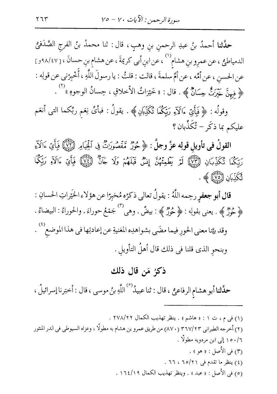 §الْقَوْلُ فِي تَأْوِيلِ قَوْلِهِ تَعَالَى: {حُورٌ مَقْصُورَاتٌ فِي الْخِيَامِ فَبِأَيِّ آلَاءِ رَبِّكُمَا تُكَذِّبَانِ لَمْ يَطْمِثْهُنَّ إِنسٌ قَبْلَهُمْ وَلَا جَانٌّ فَبِأَيِّ آلَاءِ رَبِّكُمَا تُكَذِّبَانِ} [الرحمن: 73] يَقُولُ تَعَالَى ذِكْرُهُ مُخْبِرًا عَنْ هَؤُلَاءِ الْخَيْرَاتِ الْحِسَانِ {حُورٌ} [الرحمن: 72] يَعْنِي بِقَوْلِ حُورٍ: بِيضٌ، وَهِيَ جَمْعٌ حَوْرَاءَ، وَالْحَوْرَاءُ: الْبَيْضَاءُ وَقَدْ بَيَّنَّا مَعْنَى الْحُورِ فِيمَا مَضَى بِشَوَاهِدِهِ الْمُغْنِيَةِ عَنْ إِعَادَتِهَا فِي هَذَا الْمَوْضِعِ. وَبِنَحْوِ الَّذِي قُلْنَا فِي ذَلِكَ قَالَ أَهْلُ التَّأْوِيلِ
