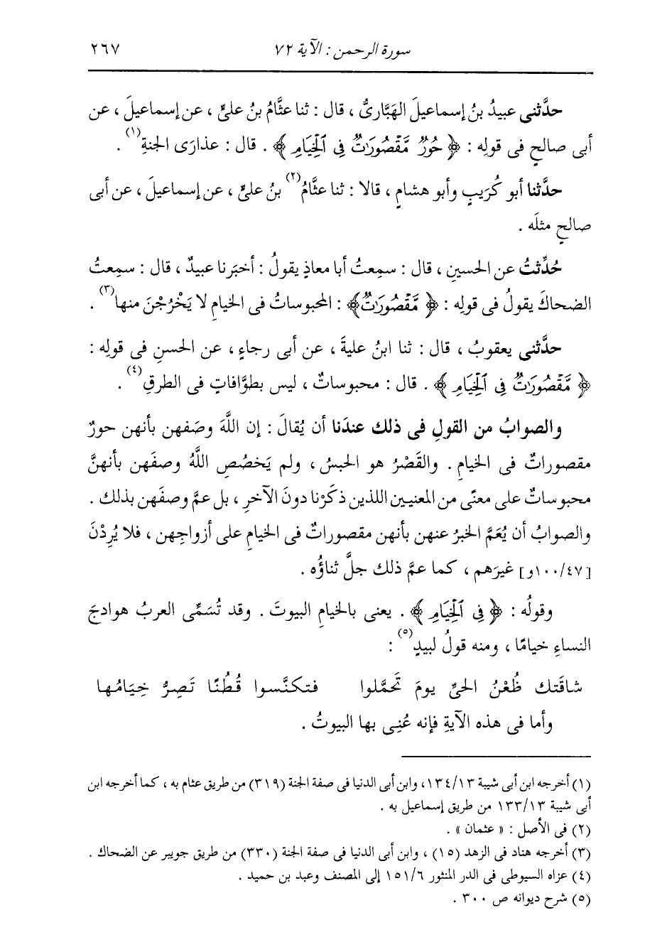 حَدَّثَنِي يَعْقُوبُ قَالَ: ثَنَا ابْنُ عُلَيَّةَ، عَنْ أَبِي رَجَاءٍ، عَنِ الْحَسَنِ، فِي قَوْلِهِ: {§مَقْصُورَاتٌ فِي الْخِيَامِ} [الرحمن: 72] قَالَ: «مَحْبُوسَاتٌ، لَيْسَ بِطَوَّافَاتٍ فِي الطُّرُقِ» وَالصَّوَابُ مِنَ الْقَوْلِ فِي ذَلِكَ عِنْدَنَا أَنْ يُقَالَ: إِنَّ اللَّهَ تَبَارَكَ وَتَعَالَى وَصَفَهُنَّ بِأَنَّهُنَّ مَقْصُورَاتٌ فِي الْخِيَامِ وَالْقَصْرُ: هُوَ الْحَبْسُ وَلَمْ يُخَصِّصْ وَصْفَهُنَّ بِأَنَّهُنَّ مَحْبُوسَاتٌ عَلَى مَعْنَى مِنَ الْمَعْنَيَيْنِ اللَّذَيْنِ ذَكَرْنَا دُونَ الْآخَرِ بَلْ عَمَّ وَصْفَهُنَّ بِذَلِكَ وَالصَّوَابُ أَنْ يَعُمَّ الْخَبَرُ عَنْهُنَّ بِأَنَّهُنَّ مَقْصُورَاتٌ فِي الْخِيَامِ عَلَى أَزْوَاجِهِنَّ، فَلَا يُرِدْنَ غَيْرَهُمْ، كَمَا عَمَّ ذَلِكَ