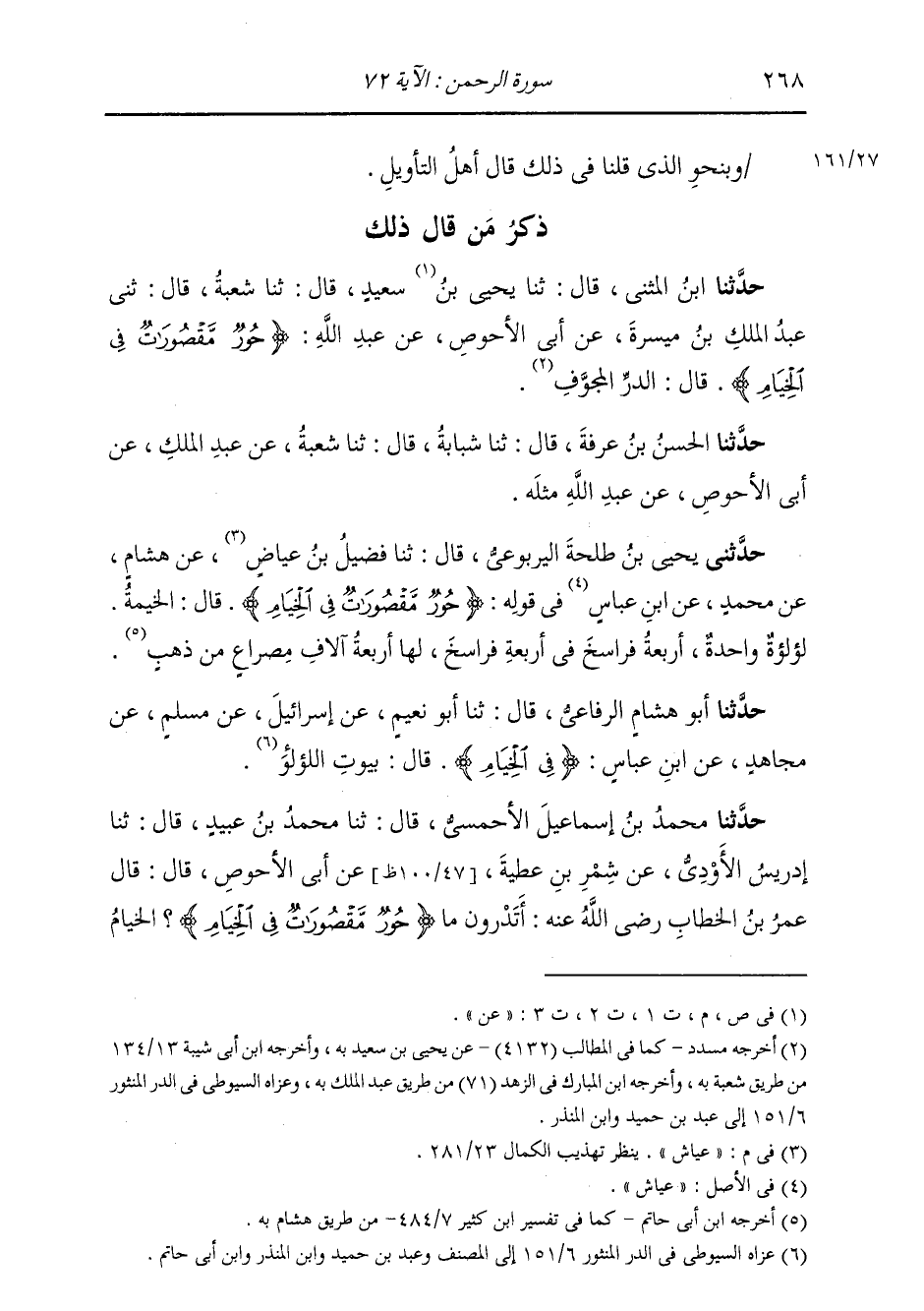 ذِكْرُ مَنْ قَالَ ذَلِكَ: حَدَّثَنَا ابْنُ الْمُثَنَّى قَالَ: ثَنَا يَحْيَى بْنُ سَعِيدٍ قَالَ: ثَنَا شُعْبَةُ قَالَ: ثَنَا عَبْدُ الْمَلِكِ بْنُ مَيْسَرَةَ، عَنْ أَبِي الْأَحْوَصِ، عَنْ عَبْدِ اللَّهِ، {§حُورٌ مَقْصُورَاتٌ فِي الْخِيَامِ} [الرحمن: 72] قَالَ: «الدُّرُّ الْمُجَوَّفُ» حَدَّثَنَا الْحَسَنُ بْنُ عَرَفَةَ قَالَ: ثَنَا شَبَابَةُ قَالَ: ثَنَا شُعْبَةُ، عَنْ عَبْدِ الْمَلِكِ، عَنْ أَبِي الْأَحْوَصِ، عَنْ عَبْدِ اللَّهِ، مِثْلَهُ