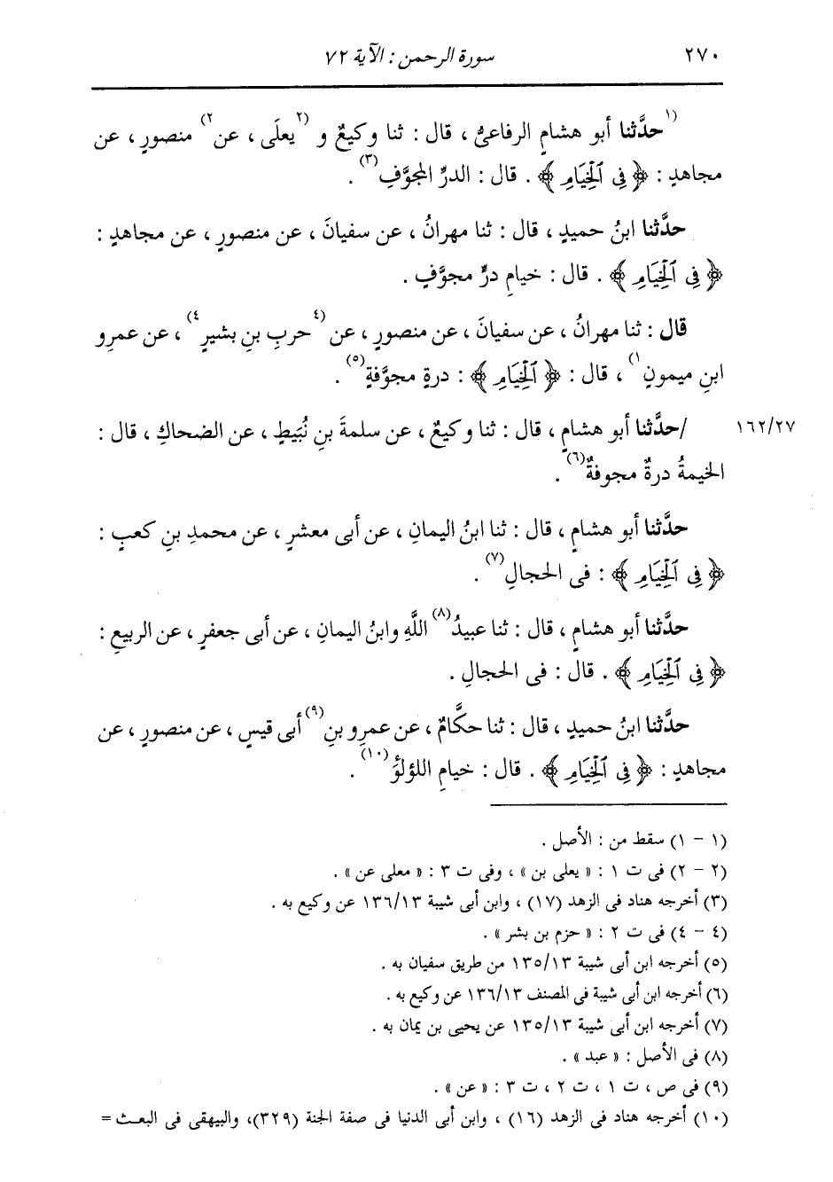 حَدَّثَنَا ابْنُ حُمَيْدٍ قَالَ: ثَنَا مِهْرَانُ، عَنْ سُفْيَانَ، عَنْ مَنْصُورٍ، عَنْ مُجَاهِدٍ، {§فِي الْخِيَامِ} [الرحمن: 72] قَالَ: «خِيَامُ دُرٍّ مُجَوَّفٍ»