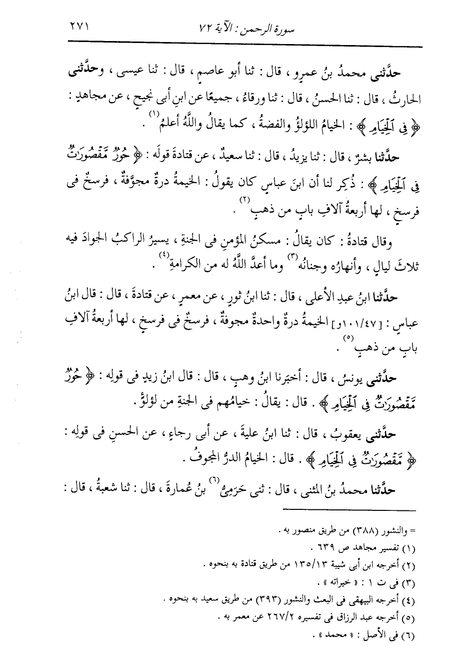 حَدَّثَنِي مُحَمَّدُ بْنُ عَمْرٍو قَالَ: ثَنَا أَبُو عَاصِمٍ قَالَ: ثَنَا عِيسَى، وَحَدَّثَنِي الْحَارِثُ قَالَ: ثَنَا الْحَسَنُ قَالَ: ثَنَا وَرْقَاءُ، جَمِيعًا، عَنِ ابْنِ أَبِي نَجِيحٍ، عَنْ مُجَاهِدٍ، {§فِي الْخِيَامِ} [الرحمن: 72] «الْخِيَامُ اللُّؤْلُؤُ وَالْفِضَّةُ، كَمَا يُقَالُ وَاللَّهُ أَعْلَمُ»