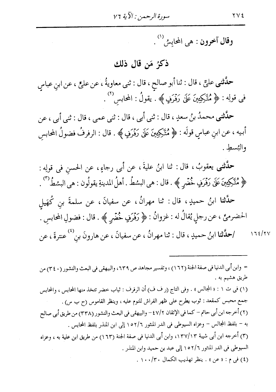 حَدَّثَنَا ابْنُ حُمَيْدٍ قَالَ: ثَنَا مِهْرَانُ، عَنْ سُفْيَانَ، عَنْ سَلَمَةَ بْنِ كُهَيْلٍ الْحَضْرَمِيِّ، عَنْ رَجُلٍ، يُقَالُ لَهُ غَزْوَانُ {§رَفْرَفٍ خُضْرٍ} [الرحمن: 76] قَالَ: «فُضُولُ الْمَحَابِسِ»