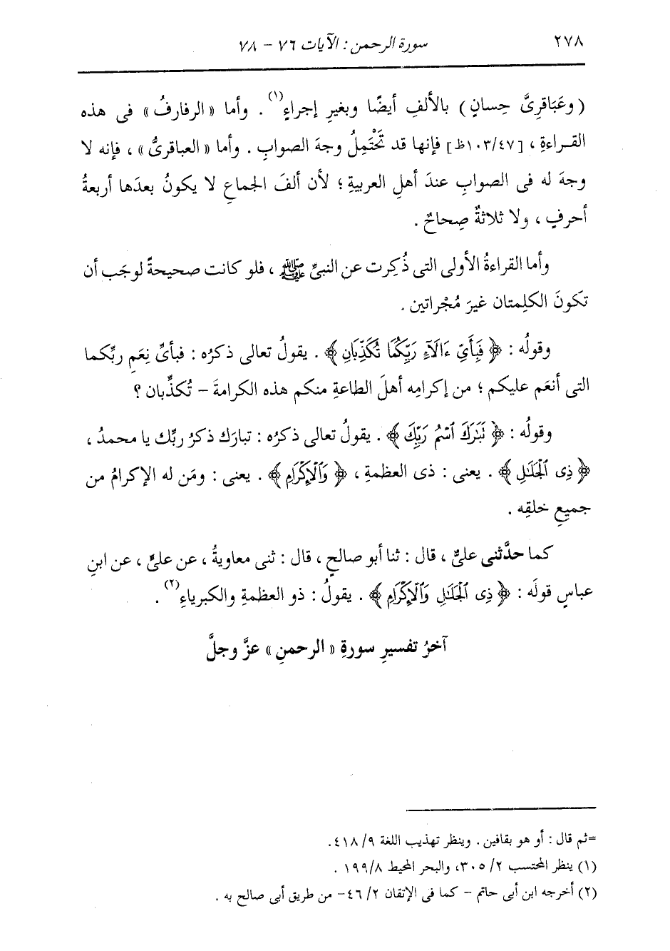 (وَعَبَاقِرِيٍّ حِسَانٍ) بِالْأَلِفِ أَيْضًا، وَبِغَيْرِ إِجْرَاءٍ وَأَمَّا الرَّفَارِفُ فِي هَذِهِ الْقِرَاءَةِ، فَإِنَّهَا قَدْ تَحْتَمِلُ وَجْهَ الصَّوَابِ وَأَمَّا الْعَبَاقِرِيُّ، فَإِنَّهُ لَا وَجْهَ لَهُ فِي الصَّوَابِ عِنْدَ أَهْلِ الْعَرَبِيَّةِ، لِأَنَّ أَلِفَ الْجِمَاعِ لَا يَكُونُ بَعْدَهَا أَرْبَعَةُ أَحْرُفٍ، وَلَا ثَلَاثَةٌ صِحَاحٌ وَأَمَّا الْقِرَاءَةُ الْأُولَى الَّتِي ذُكِرَتْ عَنِ النَّبِيِّ صَلَّى اللهُ عَلَيْهِ وَسَلَّمَ، فَلَوْ كَانَتْ صَحِيحَةً، لَوَجَبَ أَنْ تَكُونَ الْكَلِمَتَانِ غَيْرَ مُجْرَاتَيْنِ