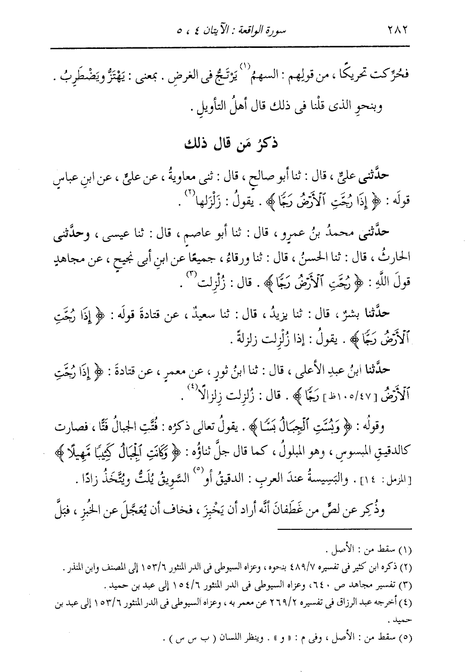 ذِكْرُ مَنْ قَالَ ذَلِكَ: حَدَّثَنِي عَلِيٌّ قَالَ: ثَنَا أَبُو صَالِحٍ قَالَ: ثَنِي مُعَاوِيَةُ، عَنْ عَلِيٍّ، عَنِ ابْنِ عَبَّاسٍ، قَوْلَهُ: {§إِذَا رُجَّتِ الْأَرْضُ رَجًّا} [الواقعة: 4] يَقُولُ: «زَلزْلَهَا»