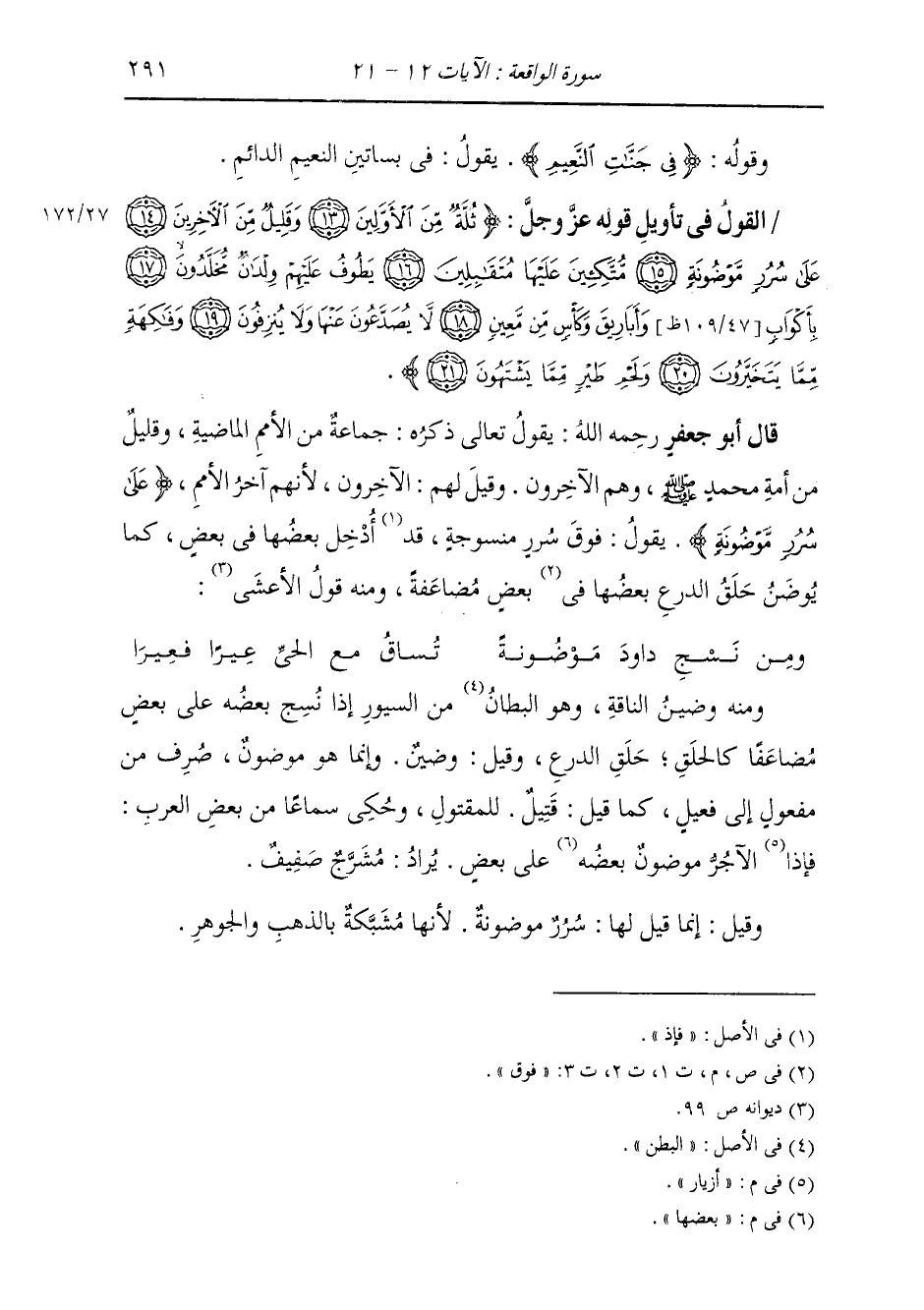 {§عَلَى سُرُرٍ مَوْضُونَةٍ} [الواقعة: 15] يَقُولُ: فَوْقَ سُرَرٍ مَنْسُوجَةٍ، قَدْ أُدْخِلَ بَعْضُهَا فِي بَعْضٍ، كَمَا يُوضَنُ حَلَقُ الدِّرْعِ بَعْضُهَا فَوْقَ بَعْضٍ مُضَاعَفَةً؛ وَمِنْهُ قَوْلُ الْأَعْشَى: