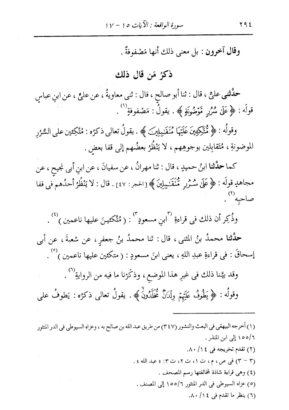 ذِكْرُ مَنْ قَالَ ذَلِكَ: حَدَّثَنِي عَلِيٌّ قَالَ: ثَنَا أَبُو صَالِحٍ قَالَ: ثَنِي مُعَاوِيَةُ، عَنْ عَلِيٍّ، عَنِ ابْنِ عَبَّاسٍ، قَوْلَهُ: {§عَلَى سُرُرٍ مَوْضُونَةٍ} [الواقعة: 15] يَقُولُ: «مَصْفُوفَةٍ»