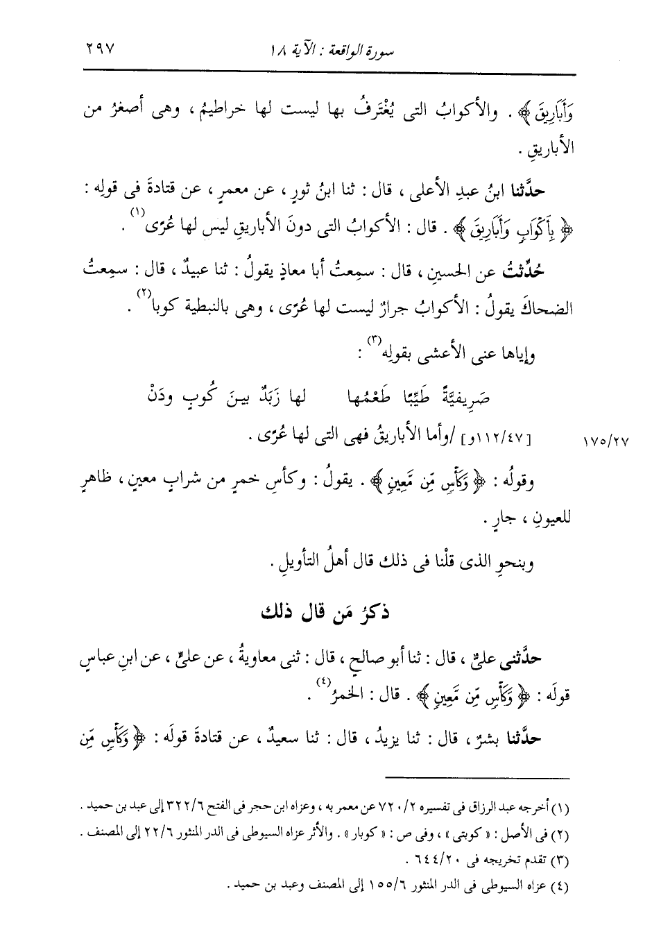 ذِكْرُ مَنْ قَالَ ذَلِكَ: حَدَّثَنِي عَلِيٌّ قَالَ: ثَنَا أَبُو صَالِحٍ قَالَ: ثَنِي مُعَاوِيَةُ، عَنْ عَلِيٍّ، عَنِ ابْنِ عَبَّاسٍ، قَوْلَهُ: {§وَكَأْسٍ مِنْ مَعِينِ} [الواقعة: 18] قَالَ «الْخَمْرُ»
