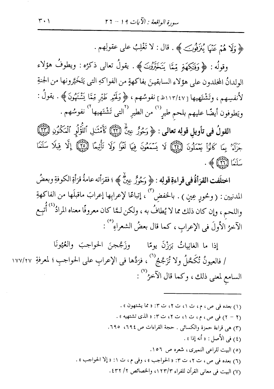 §الْقَوْلُ فِي تَأْوِيلِ قَوْلِهِ تَعَالَى: {وَحُورٌ عِينٌ كَأَمْثَالِ اللُّؤْلُؤِ الْمَكْنُونِ جَزَاءً بِمَا كَانُوا يَعْمَلُونَ لَا يَسْمَعُونَ فِيهَا لَغْوًا وَلَا تَأْثِيمًا إِلَّا قِيلًا سَلَامًا سَلَامًا} [الواقعة: 23] اخْتَلَفَتِ الْقُرَّاءُ فِي قِرَاءَةِ قَوْلِهِ: {وَحُورٌ عِينٌ} [الواقعة: 22] فَقَرَأَتْهُ عَامَّةُ قُرَّاءِ الْكُوفَةِ وَبَعْضُ الْمَدَنِيِّينَ (وَحُورٍ عِينٍ) بِالْخَفْضِ إِتْبَاعًا لِإِعْرَابِهَا إِعْرَابَ مَا قَبْلَهَا مِنَ الْفَاكِهَةِ وَاللَّحْمِ، وَإِنْ كَانَ ذَلِكَ مِمَّا لَا يُطَافُ بِهِ، وَلَكِنْ لَمَّا كَانَ مَعْرُوفًا مَعْنَاهُ الْمُرَادُ أُتْبِعَ الْآخِرُ الْأَوَّلَ فِي الْإِعْرَابِ، كَمَا قَالَ بَعْضُ الشُّعَرَاءِ: