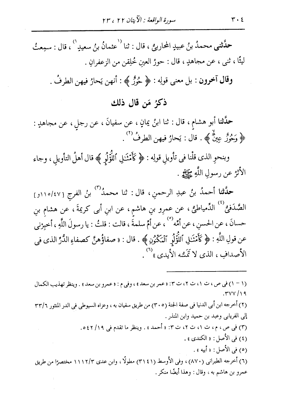 ذِكْرُ مَنْ قَالَ ذَلِكَ: حَدَّثَنَا أَبُو هِشَامٍ قَالَ: ثَنَا ابْنُ يَمَانٍ، عَنْ سُفْيَانَ، عَنْ رَجُلٍ، عَنْ مُجَاهِدٍ، {§وَحُورٌ عِينٌ} [الواقعة: 22] قَالَ: «يَحَارُ فِيهِنَّ الطَّرْفُ» وَبِنَحْوِ الَّذِي قُلْنَا فِي تَأْوِيلِ قَوْلِهِ: {كَأَمْثَالِ اللُّؤْلُؤِ} [الواقعة: 23] قَالَ أَهْلُ التَّأْوِيلِ، وَجَاءَ الْأَثَرُ عَنْ رَسُولِ اللَّهِ صَلَّى اللهُ عَلَيْهِ وَسَلَّمَ