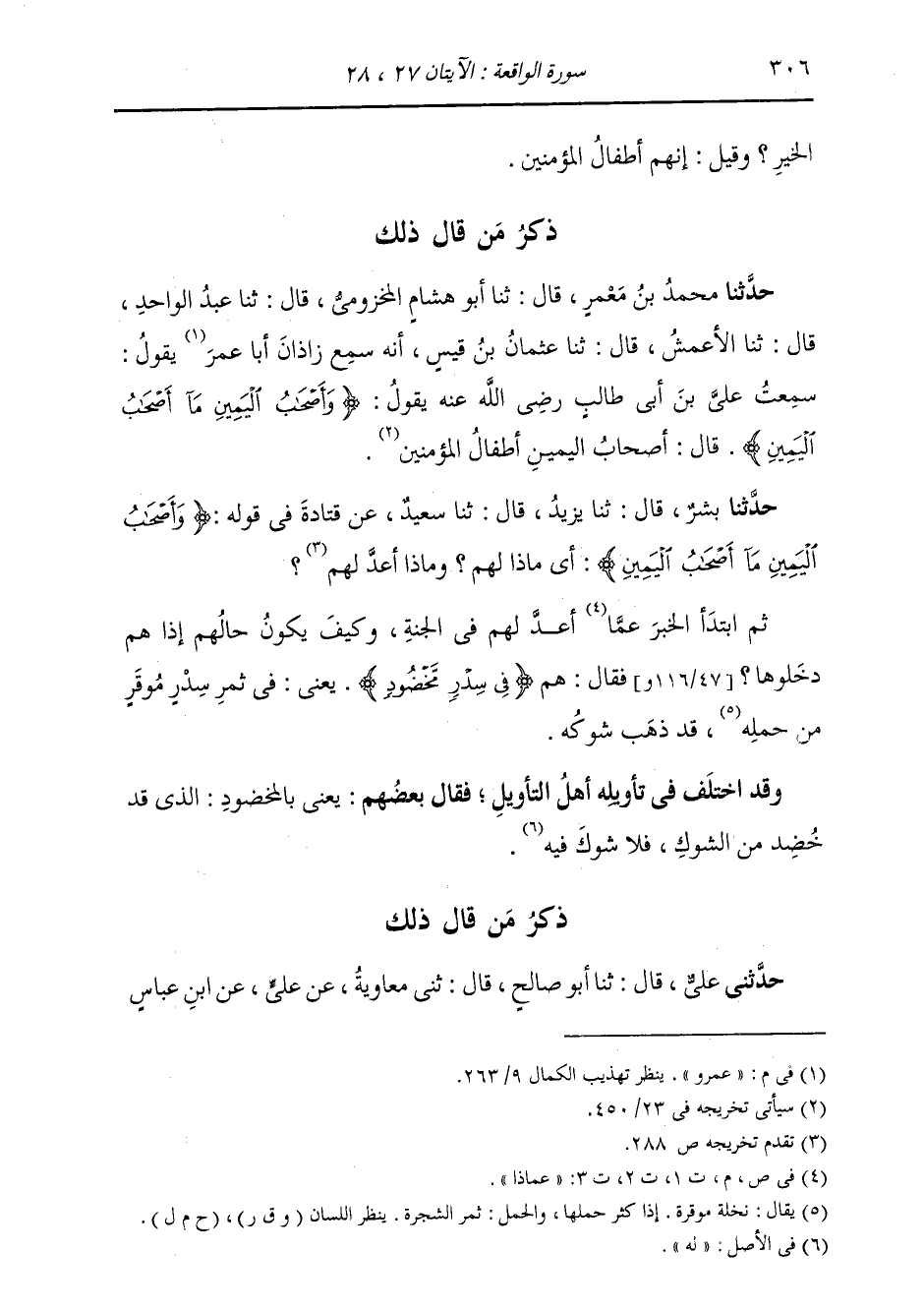 ذِكْرُ مَنْ قَالَ ذَلِكَ: حَدَّثَنَا مُحَمَّدُ بْنُ مَعْمَرٍ قَالَ: ثَنَا أَبُو هِشَامٍ الْمَخْزُومِيُّ قَالَ: ثَنَا عَبْدُ الْوَاحِدِ قَالَ: ثَنَا الْأَعْمَشُ قَالَ: ثَنَا عُثْمَانُ بْنُ قَيْسٍ، أَنَّهُ سَمِعَ زَاذَانَ أَبَا عَمْرٍو، يَقُولُ: سَمِعْتُ عَلِيَّ بْنَ أَبِي طَالِبٍ رَضِيَ اللَّهُ عَنْهُ يَقُولُ: {§وَأَصْحَابُ الْيَمِينِ مَا أَصْحَابُ الْيَمِينِ} [الواقعة: 27] قَالَ: " أَصْحَابُ الْيَمِينِ: أَطْفَالُ الْمُؤْمِنِينَ "