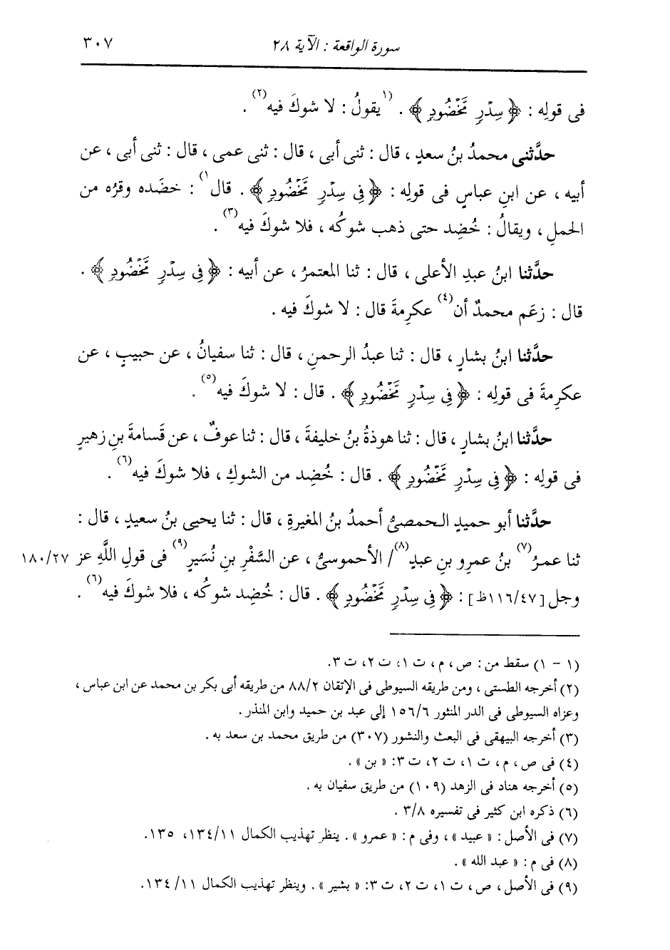حَدَّثَنَا أَبُو حُمَيْدٍ الْحِمْصِيُّ أَحْمَدُ بْنُ الْمُغِيرَةِ قَالَ: ثَنَا يَحْيَى بْنُ سَعِيدٍ قَالَ: ثَنَا عَمْرُو بْنُ عَمْرِو بْنِ عَبْدِ اللَّهِ الْأُحْمُوسِيُّ، عَنِ السَّفَرِ بْنِ نُسَيْرٍ، فِي قَوْلِ اللَّهِ عَزَّ وَجَلَّ {§فِي سِدْرٍ مَخْضُودٍ} [الواقعة: 28] قَالَ: «خُضِّدَ شَوْكُهُ، فَلَا شَوْكَ فِيهِ»