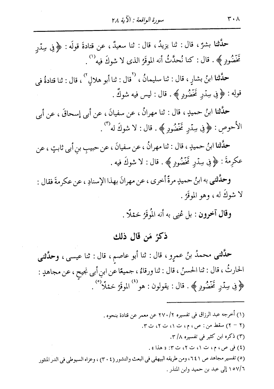 حَدَّثَنَا مِهْرَانُ، عَنْ سُفْيَانَ، عَنْ حَبِيبِ بْنِ أَبِي ثَابِتٍ، عَنْ عِكْرِمَةَ {§فِي سِدْرٍ مَخْضُودٍ} [الواقعة: 28] قَالَ: «لَا شَوْكَ فِيهِ» وَحَدَّثَنِي بِهِ ابْنُ حُمَيْدٍ مَرَّةً أُخْرَى، عَنْ مِهْرَانَ بِهَذَا الْإِسْنَادِ، عَنْ عِكْرِمَةَ، فَقَالَ: «لَا شَوْكَ لَهُ، وَهُوَ الْمُوقَّرُ» وَقَالَ آخَرُونَ: بَلْ عُنِيَ بِهِ أَنَّهُ الْمُوقَّرُ حِمْلًا
