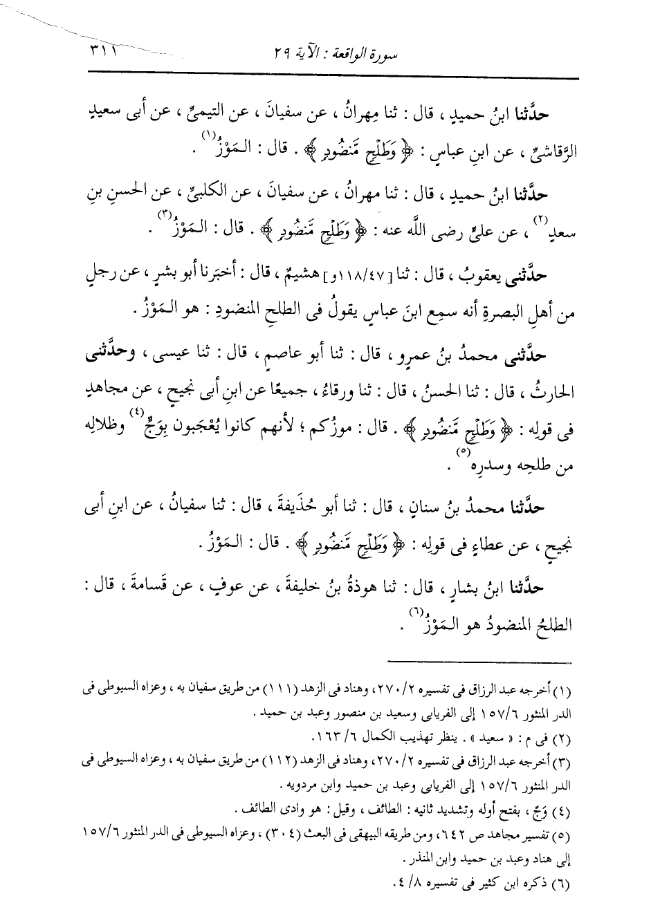قَالَ: ثَنَا مِهْرَانُ، عَنْ سُفْيَانَ، عَنِ الْكَلْبِيِّ، عَنِ الْحَسَنِ بْنِ سَعِيدٍ، عَنْ عَلِيٍّ، رَضِيَ اللَّهُ عَنْهُ {§وَطَلْحٍ مَنْضُودٍ} [الواقعة: 29] قَالَ: «الْمَوْزُ»