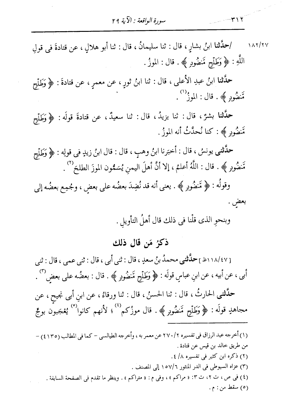 قَالَ: ثَنَا سُلَيْمَانُ قَالَ: ثَنَا أَبُو هِلَالٍ، عَنْ قَتَادَةَ، فِي قَوْلِ اللَّهِ: {§وَطَلْحٍ مَنْضُودٍ} [الواقعة: 29] قَالَ: «الْمَوْزُ»