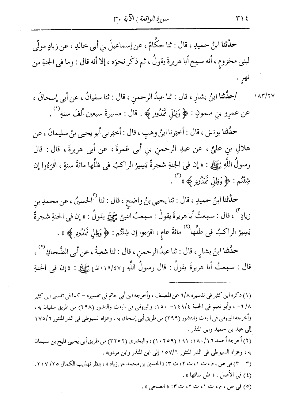 حَدَّثَنَا ابْنُ حُمَيْدٍ قَالَ: ثَنَا يَحْيَى بْنُ وَاضِحٍ قَالَ: ثَنَا الْحُسَيْنُ بْنُ مُحَمَّدٍ، عَنْ زِيَادٍ قَالَ: سَمِعْتُ أَبَا هُرَيْرَةَ يَقُولُ: سَمِعْتُ النَّبِيَّ صَلَّى اللهُ عَلَيْهِ وَسَلَّمَ يَقُولُ: «إِنَّ §فِي الْجَنَّةِ شَجَرَةً يَسِيرُ الرَّاكِبُ فِي ظِلِّهَا مِئَةَ عَامٍ لَا يَقْطَعُهَا، وَاقْرَأُوا إِنْ شِئْتُمْ» {وَظِلٍّ مَمْدُودٍ} [الواقعة: 30]