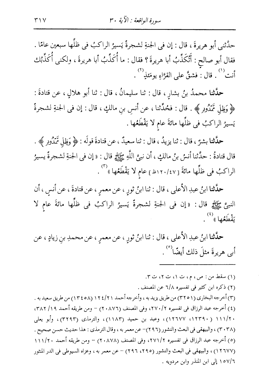 قَالَ: ثَنَا بِشْرٌ قَالَ: ثَنَا يَزِيدُ قَالَ: ثَنَا سَعِيدٌ، عَنْ قَتَادَةَ، قَوْلَهُ: {وَظِلٍّ مَمْدُودٍ} [الواقعة: 30] قَالَ قَتَادَةُ: حَدَّثَنَا أَنَسُ بْنُ مَالِكٍ، أَنَّ نَبِيَّ اللَّهِ صَلَّى اللهُ عَلَيْهِ وَسَلَّمَ قَالَ: «§إِنَّ فِي الْجَنَّةِ لَشَجَرَةً يَسِيرُ الرَّاكِبُ فِي ظِلِّهَا مِائَةَ عَامٍ لَا يَقْطَعُهَا»