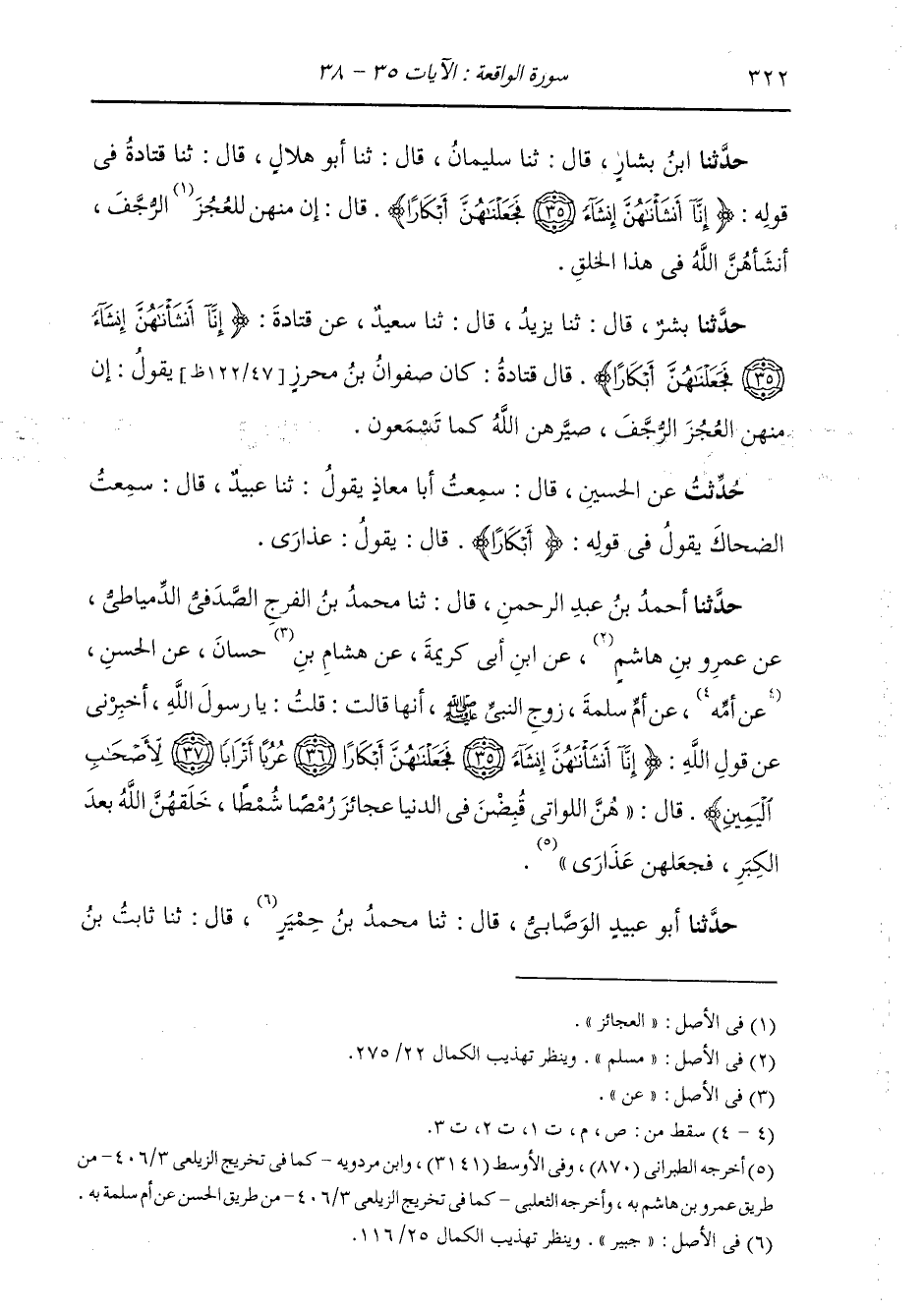 حَدَّثَنَا أَبُو عُبَيْدٍ الْوَصَّابِيُّ قَالَ: ثَنَا مُحَمَّدُ بْنُ حِمْيَرٍ قَالَ: ثَنَا ثَابِتُ بْنُ -[323]- عَجْلَانَ قَالَ: سَمِعْتُ سَعِيدَ بْنَ جُبَيْرٍ، يُحَدِّثُ عَنِ ابْنِ عَبَّاسٍ، فِي قَوْلِهِ: {§إِنَّا أَنْشَأْنَاهُنَّ إِنْشَاءً فَجَعَلْنَاهُنَّ أَبْكَارًا عُرُبًا أَتْرَابًا} [الواقعة: 36] قَالَ: «هُنَّ مِنْ بَنِي آدَمَ، نِسَاءُكُنَّ فِي الدُّنْيَا يُنْشِئُهُنَّ اللَّهُ أَبْكَارًا عَذَارَى عُرُبًا»