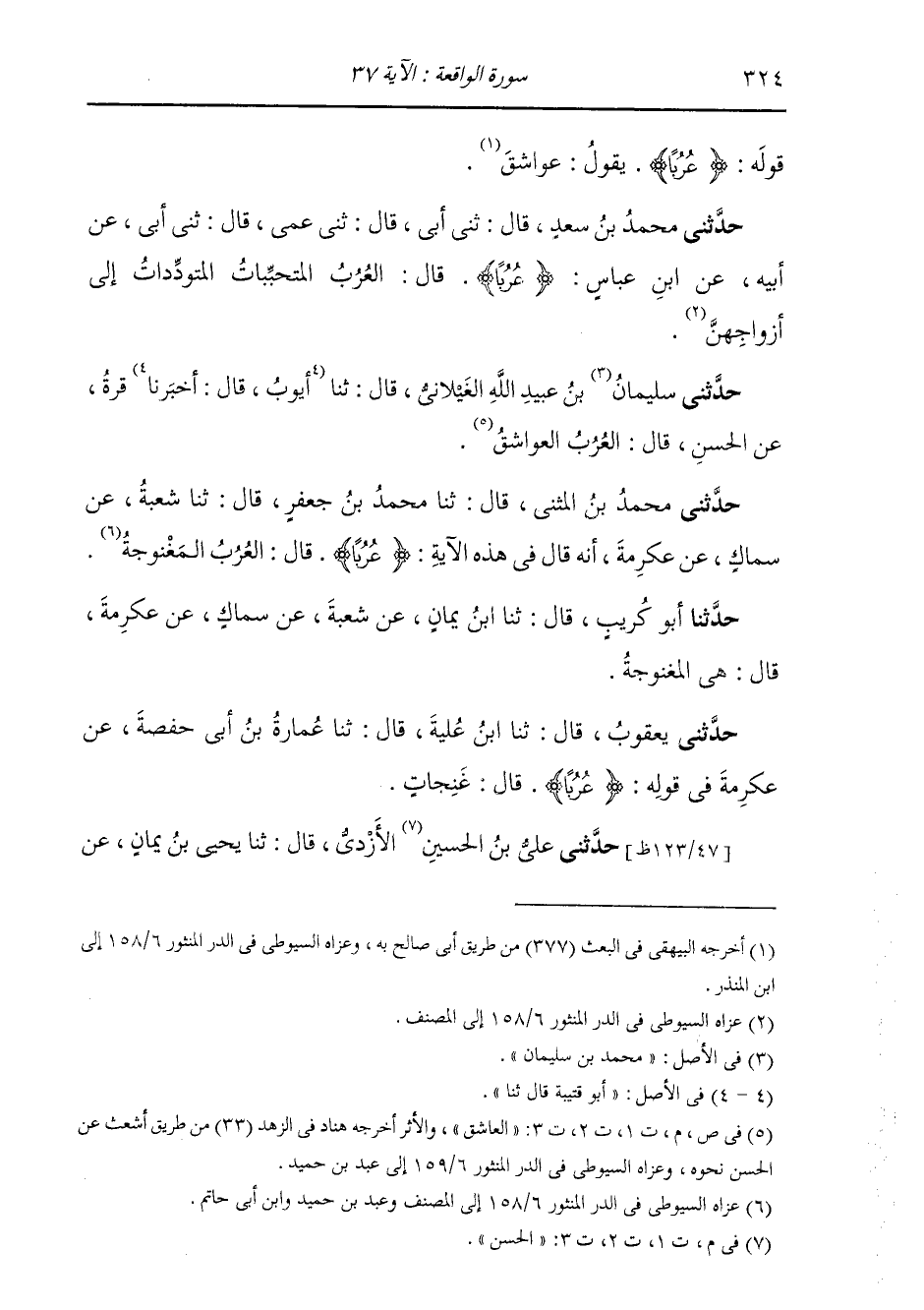 حَدَّثَنِي مُحَمَّدُ بْنُ سَعْدٍ قَالَ: ثَنِي أَبِي قَالَ: ثَنِي عَمِّي قَالَ: ثَنِي أَبِي، عَنْ أَبِيهِ، عَنِ ابْنِ عَبَّاسٍ، {§عُرُبًا} [الواقعة: 37] قَالَ: «الْعُرُبُ الْمُتَحَبِّبَاتُ الْمُتَوَدِّدَاتُ إِلَى أَزْوَاجِهِنَّ»
