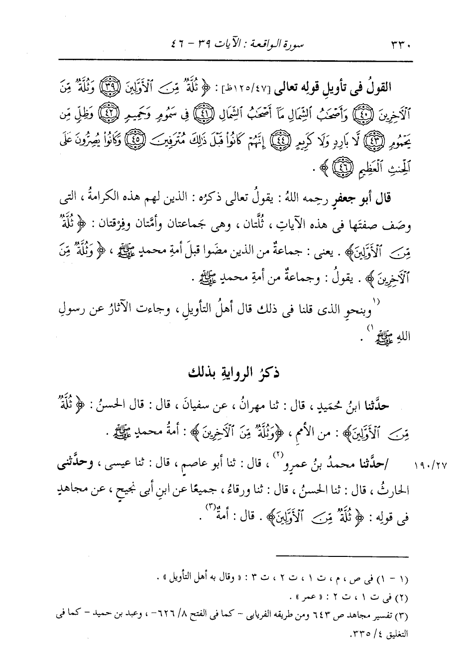 §الْقَوْلُ فِي تَأْوِيلِ قَوْلِهِ تَعَالَى: {ثُلَّةٌ مِنَ الْأَوَّلِينَ وَثُلَّةٌ مِنَ الْآخِرِينَ وَأَصْحَابُ الشِّمَالِ مَا أَصْحَابُ الشِّمَالِ فِي سَمُومٍ وَحَمِيمٍ وَظِلٍّ مِنْ يَحْمُومٍ لَا بَارِدٍ وَلَا كَرِيمٍ إِنَّهُمْ كَانُوا قَبْلَ ذَلِكَ مُتْرَفِينَ وَكَانُوا يُصِرُّونَ عَلَى الْحِنْثِ الْعَظِيمِ} [الواقعة: 40] يَقُولُ تَعَالَى ذِكْرُهُ: الَّذِينَ لَهُمْ هَذِهِ الْكَرَامَةُ الَّتِي وَصَفَ صِفَتَهَا فِي هَذِهِ الْآيَاتِ ثُلَّتَانِ، وَهِيَ جَمَاعَتَانِ وَأُمَّتَانِ وَفِرْقَتَانِ: {ثُلَّةٌ مِنَ الْأَوَّلِينَ} [الواقعة: 13] ، يَعْنِي جَمَاعَةً مِنَ الَّذِينَ مَضَوْا قَبْلَ أُمَّةِ مُحَمَّدٍ صَلَّى اللهُ عَلَيْهِ وَسَلَّمَ {وَثُلَّةٌ مِنَ الْآخَرِينَ} [الواقعة: 40] ، يَقُولُ: وَجَمَاعَةٌ مِنْ أُمَّةِ مُحَمَّدٍ صَلَّى اللهُ عَلَيْهِ وَسَلَّمَ، وَقَالَ بِهِ أَهْلُ التَّأْوِيلِ