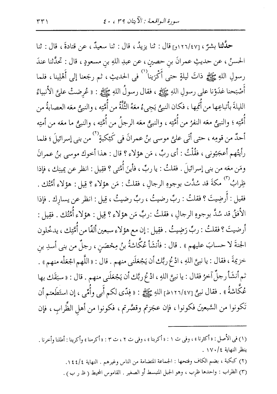 حَدَّثَنَا بِشْرٌ قَالَ: ثَنَا يَزِيدُ قَالَ: ثَنَا سَعِيدٌ، عَنْ قَتَادَةَ قَالَ: ثَنَا الْحَسَنُ، عَنْ حَدِيثِ عِمْرَانَ بْنِ حُصَيْنٍ، عَنْ عَبْدِ اللَّهِ بْنِ مَسْعُودٍ قَالَ: تَحَدَّثْنَا عِنْدَ رَسُولِ اللَّهِ صَلَّى اللهُ عَلَيْهِ وَسَلَّمَ ذَاتَ لَيْلَةٍ حَتَّى أَكْرَيْنَا فِي الْحَدِيثِ، ثُمَّ رَجَعْنَا إِلَى أَهْلِينَا، فَلَمَّا أَصْبَحْنَا غَدَوْنَا عَلَى رَسُولِ اللَّهِ صَلَّى اللهُ عَلَيْهِ وَسَلَّمَ فَقَالَ رَسُولُ اللَّهِ صَلَّى اللهُ عَلَيْهِ وَسَلَّمَ: " §عُرِضَتْ عَلَيَّ الْأَنْبِيَاءُ اللَّيْلَةَ بِأَتْبَاعِهَا مِنْ أُمَمِهَا، فَكَانَ النَّبِيُّ يَجِيءُ مَعَهُ الثُّلَّةُ مِنْ أُمَّتِهِ، وَالنَّبِيُّ مَعَهُ الْعِصَابَةُ مِنْ أُمَّتِهِ؛ وَالنَّبِيُّ مَعَهُ النَّفْرُ مِنْ أُمَّتِهِ، وَالنَّبِيُّ مَعَهُ الرَّجُلُ مِنْ أُمَّتِهِ، وَالنَّبِيُّ مَا مَعَهُ مِنْ أُمَّتِهِ أَحَدٌ مِنْ قَوْمِهِ، حَتَّى أَتَى عَلَيَّ مُوسَى بْنُ عِمْرَانَ فِي كَبْكَبَةٍ مِنْ بَنِي إِسْرَائِيلَ؛ فَلَمَّا رَأَيْتُهُمْ أَعْجَبُونِي، فَقُلْتُ: أَيْ رَبِّ مَنْ هَؤُلَاءِ؟ " قَالَ: «هَذَا أَخُوكَ مُوسَى بْنُ عِمْرَانَ وَمَنْ مَعَهُ مِنْ بَنِي إِسْرَائِيلَ» ، فَقُلْتُ: " رَبِّ، فَأَيْنَ أُمَّتِي؟ فَقِيلَ: انْظُرْ عَنْ يَمِينِكَ، فَإِذَا ظِرَابُ مَكَّةَ قَدْ سُدَّتْ بِوُجُوهِ الرِّجَالِ فَقُلْتُ: مَنْ هَؤُلَاءِ؟ قِيلَ: هَؤُلَاءِ أُمَّتُكَ، فَقِيلَ: أَرَضِيتَ؟ فَقُلْتُ: رَبِّ رَضِيتُ رَبِّ رَضِيتُ، قِيلَ: انْظُرْ عَنْ يَسَارِكَ، فَإِذَا الْأُفُقُ قَدْ سُدَّ بِوُجُوهِ الرِّجَالِ، فَقُلْتُ: رَبِّ مَنْ هَؤُلَاءِ؟ قِيلَ: هَؤُلَاءِ أُمَّتُكَ، فَقِيلَ: أَرَضِيتَ؟ فَقُلْتُ: رَضِيتُ رَبِّ، رَضِيتُ؛ فَقِيلَ: إِنَّ مَعَ هَؤُلَاءِ سَبْعِينَ أَلْفًا مِنْ أُمَّتِكَ يَدْخُلُونَ الْجَنَّةَ لَا حِسَابَ عَلَيْهِمْ "؛ قَالَ: فَأَنْشَأَ عُكَّاشَةُ بْنُ مِحْصَنٍ، رَجُلٌ مِنْ بَنِي أَسَدِ بْنِ خُزَيْمَةَ، فَقَالَ: يَا نَبِيَّ اللَّهِ ادْعُ رَبَّكَ أَنْ يَجْعَلَنِي مِنْهُمْ قَالَ: «اللَّهُمَّ اجْعَلْهُ مِنْهُمْ» ثُمَّ أَنْشَأَ رَجُلٌ آخَرُ فَقَالَ: يَا نَبِيَّ اللَّهِ ادْعُ رَبَّكَ أَنْ يَجْعَلَنِي مِنْهُمْ قَالَ: «سَبَقَكَ بِهَا عُكَّاشَةُ» فَقَالَ نَبِيُّ اللَّهِ صَلَّى اللهُ عَلَيْهِ وَسَلَّمَ: «فِدًى لَكُمْ أَبِي وَأُمِّي إِنِ اسْتَطَعْتُمْ أَنْ تَكُونُوا مِنَ السَّبْعِينَ -[332]- فَكُونُوا مِنْ أَهْلِ الْأُفُقِ، فَإِنِّي رَأَيْتُ ثَمَّ أُنَاسًا يَتَهَرَّشُونَ كَثِيرًا» أَوْ قَالَ «يَتَهَوَّشُونَ» ؛ قَالَ: فَتَرَاجَعَ الْمُؤْمِنُونَ، أَوْ قَالَ: فَتَرَاجَعْنَا عَلَى هَؤُلَاءِ السَّبْعِينَ، فَصَارَ مِنْ أَمْرِهِمْ أَنْ قَالُوا: نَرَاهُمْ نَاسًا ولِدُوا فِي الْإِسْلَامِ، فَلَمْ يَزَالُوا يَعْمَلُونَ بِهِ حَتَّى مَاتُوا عَلَيْهِ، فَنُمِيَ حَدِيثُهُمْ ذَاكَ إِلَى نَبِيِّ اللَّهِ صَلَّى اللهُ عَلَيْهِ وَسَلَّمَ، فَقَالَ: «لَيْسَ كَذَاكَ، وَلَكِنَّهُمُ الَّذِينَ لَا يَسْتَرْقُونَ، وَلَا يَكْتَوُونَ، وَلَا يَتَطَيَّرُونَ، وَعَلَى رَبِّهِمْ يَتَوَكَّلُونَ» . ذُكِرَ أَنَّ نَبِيَّ اللَّهِ صَلَّى اللهُ عَلَيْهِ وَسَلَّمَ قَالَ يَوْمَئِذٍ: «إِنِّي لَأَرْجُو أَنْ يَكُونَ مَنْ تَبِعَنِي مِنْ أُمَّتِي رُبْعَ أَهْلِ الْجَنَّةِ» فَكَبَّرْنَا، ثُمَّ قَالَ: «إِنِّي لَأَرْجُو أَنْ تَكُونُوا الشَّطْرَ» فَكَبَّرْنَا، ثُمَّ تَلَا رَسُولُ اللَّهِ صَلَّى اللهُ عَلَيْهِ وَسَلَّمَ هَذِهِ الْآيَةَ: {ثُلَّةٌ مِنَ الْأَوَّلِينَ وَثُلَّةٌ مِنَ الْآخَرِينَ} [الواقعة: 40] حَدَّثَنَا أَبُو كُرَيْبٍ قَالَ: ثَنَا الْحَسَنُ بْنُ بِشْرٍ الْبَجَلِيُّ، عَنِ الْحَكَمِ بْنِ عَبْدِ الْمَلِكِ، عَنْ قَتَادَةَ، عَنِ الْحَسَنِ، عَنْ عِمْرَانَ ب