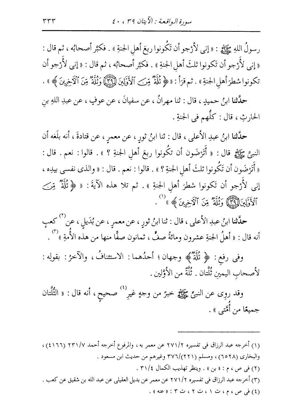 حَدَّثَنَا ابْنُ عَبْدِ الْأَعْلَى قَالَ: ثَنَا ابْنُ ثَوْرٍ، عَنْ مَعْمَرٍ، عَنْ قَتَادَةَ، أَنَّهُ بَلَغَهُ أَنَّ النَّبِيَّ صَلَّى اللهُ عَلَيْهِ وَسَلَّمَ قَالَ: «§أَتَرْضَوْنَ أَنْ تَكُونُوا رُبْعَ أَهْلِ الْجَنَّةِ؟» قَالُوا: نَعَمْ قَالَ: «أَتَرْضَوْنَ أَنْ تَكُونُوا ثُلُثَ أَهْلِ الْجَنَّةِ؟» قَالُوا: نَعَمْ قَالَ: «وَالَّذِي نَفْسِي بِيَدِهِ إِنِّي لَأَرْجُو أَنْ تَكُونُوا شَطْرَ أَهْلِ الْجَنَّةِ» ثُمَّ تَلَا هَذِهِ الْآيَةَ {ثُلَّةٌ مِنَ الْأَوَّلِينَ وَثُلَّةٌ مِنَ الْآخَرِينَ} [الواقعة: 40]