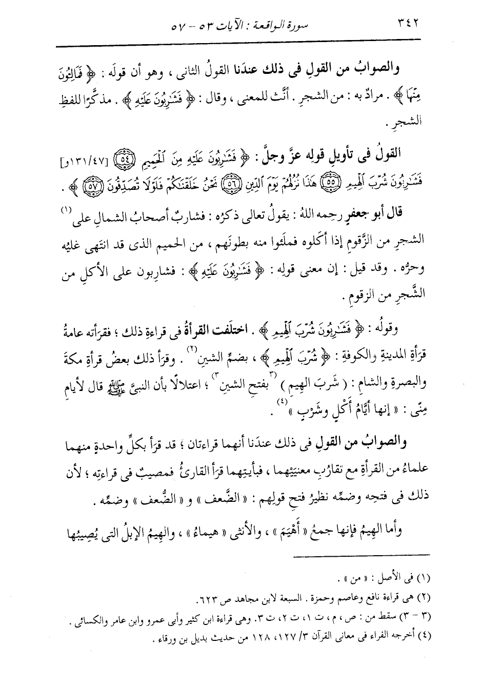 §وَقَوْلُهُ: {فَشَارِبُونَ شُرْبَ الْهِيمِ} [الواقعة: 55] اخْتَلَفَتِ الْقُرَّاءُ فِي قِرَاءَةِ ذَلِكَ، فَقَرَأَتْهُ عَامَّةُ قُرَّاءِ الْمَدِينَةِ وَالْكُوفَةِ {شُرْبَ الْهِيمِ} [الواقعة: 55] بِضَمِّ الشِّينِ، وَقَرَأَ ذَلِكَ بَعْضُ قُرَّاءِ مَكَّةَ وَالْبَصْرَةِ وَالشَّأْمِ (شَرْبَ الْهِيمِ) اعْتِلَالًا بِأَنَّ النَّبِيَّ صَلَّى اللهُ عَلَيْهِ وَسَلَّمَ قَالَ لِأَيَّامِ مِنًى: «إِنَّهَا أَيَّامُ أَكْلٍ وَشُرْبٍ» وَالصَّوَابُ مِنَ الْقَوْلِ فِي ذَلِكَ عِنْدَنَا أَنْ يُقَالَ: إِنَّهُمَا قِرَاءَتَانِ قَدْ قَرَأَ بِكُلِّ وَاحِدَةٍ مِنْهُمَا عُلَمَاءُ مِنَ الْقُرَّاءِ مَعَ تَقَارُبِ مَعْنَيَيْهِمَا، فَبِأَيَّتِهِمَا قَرَأَ الْقَارِئُ فَمُصِيبٌ فِي قِرَاءَتِهِ، لِأَنَّ ذَلِكَ فِي فَتْحِهِ وَضَمِّهِ نَظِيرُ فَتْحِ قَوْلِهِمُ: الضَّعْفُ وَالضُّعْفُ بِضَمِّهِ وَأَمَّا الْهِيمُ، فَإِنَّهَا جَمْعُ أَهْيَمَ، وَالْأُنْثَى هَيْمَاءُ؛ وَالْهِيمُ: الْإِبِلُ الَّتِي يُصِيبُهَا