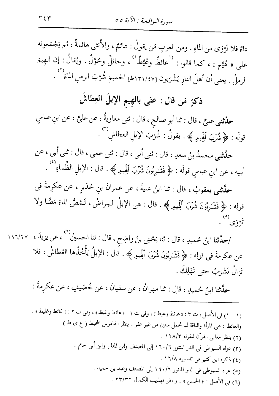 ذِكْرُ مَنْ قَالَ عَنَى بِالْهِيمِ الْإِبِلَ الْعِطَاشَ: حَدَّثَنِي عَلِيٌّ قَالَ: ثَنَا أَبُو صَالِحٍ قَالَ: ثَنِي مُعَاوِيَةُ، عَنْ عَلِيٍّ، عَنِ ابْنِ عَبَّاسٍ، قَوْلَهُ: {§شُرْبَ الْهِيمِ} [الواقعة: 55] يَقُولُ: «شُرْبَ الْإِبِلِ الْعِطَاشِ»