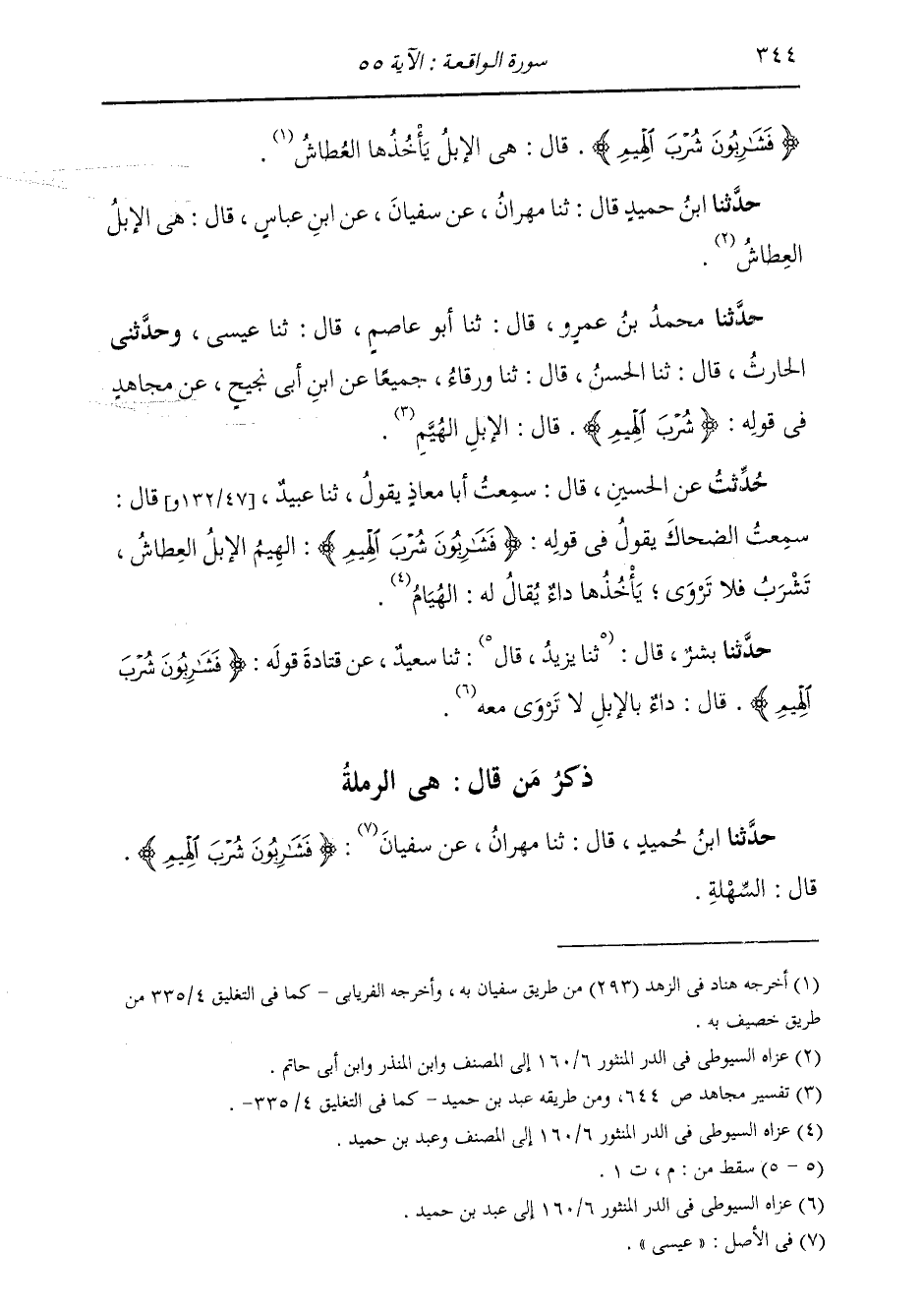 ذِكْرُ مَنْ قَالَ هِيَ الرَّمْلَةُ: حَدَّثَنَا ابْنُ حُمَيْدٍ قَالَ: ثَنَا مِهْرَانُ، عَنْ سُفْيَانَ، {§فَشَارِبُونَ شُرْبَ الْهِيمِ} [الواقعة: 55] قَالَ: «السِّهْلَةِ»