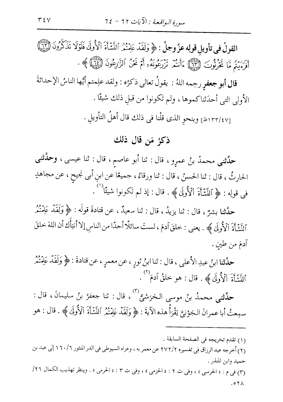 حَدَّثَنِي مُحَمَّدُ بْنُ مُوسَى الْحَرَسِيُّ قَالَ: ثَنَا جَعْفَرُ بْنُ سُلَيْمَانَ قَالَ: سَمِعْتُ أَبَا عِمْرَانَ الْجَوْنِيَّ، يَقْرَأُ هَذِهِ الْآيَةَ {§وَلَقَدْ عَلِمْتُمُ النَّشْأَةَ الْأُولَى} [الواقعة: 62] قَالَ: «هُوَ -[348]- خَلْقُ آدَمَ»