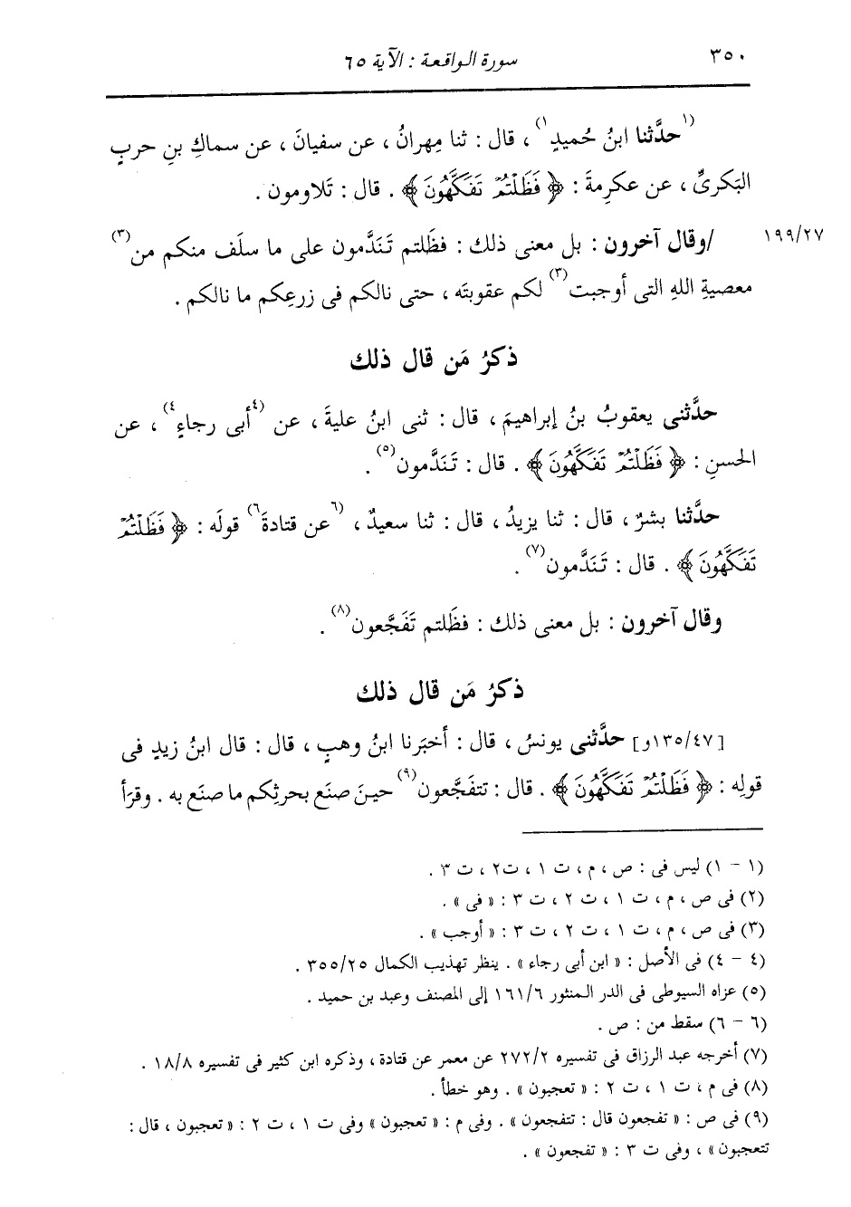 ذِكْرُ مَنْ قَالَ ذَلِكَ: حَدَّثَنِي يَعْقُوبُ بْنُ إِبْرَاهِيمَ قَالَ: ثَنِي ابْنُ عُلَيَّةَ، عَنْ أَبِي رَجَاءٍ، عَنِ الْحَسَنِ، {§فَظَلْتُمْ تَفَكَّهُونَ} قَالَ: «تَنْدَمُونَ»